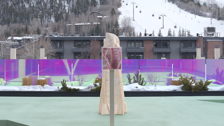 Raw Is the Red by Shahryar Nashat transforms the roof terrace of Aspen Art Museum into a sculptural confrontation framed by the commanding presence of Aspen Mountain. At its center stands a vitrine encasing a “meat object,” an image of raw flesh on powder-coated steel, covered in a translucent layer of acrylic gel. Behind it rises a pink marble obelisk whose scale is that of the artist’s own height. Together, they evoke the body as both physical presence and mental projection, as a carrier of both empathy and distance.