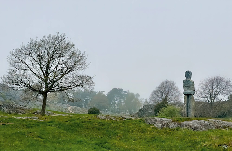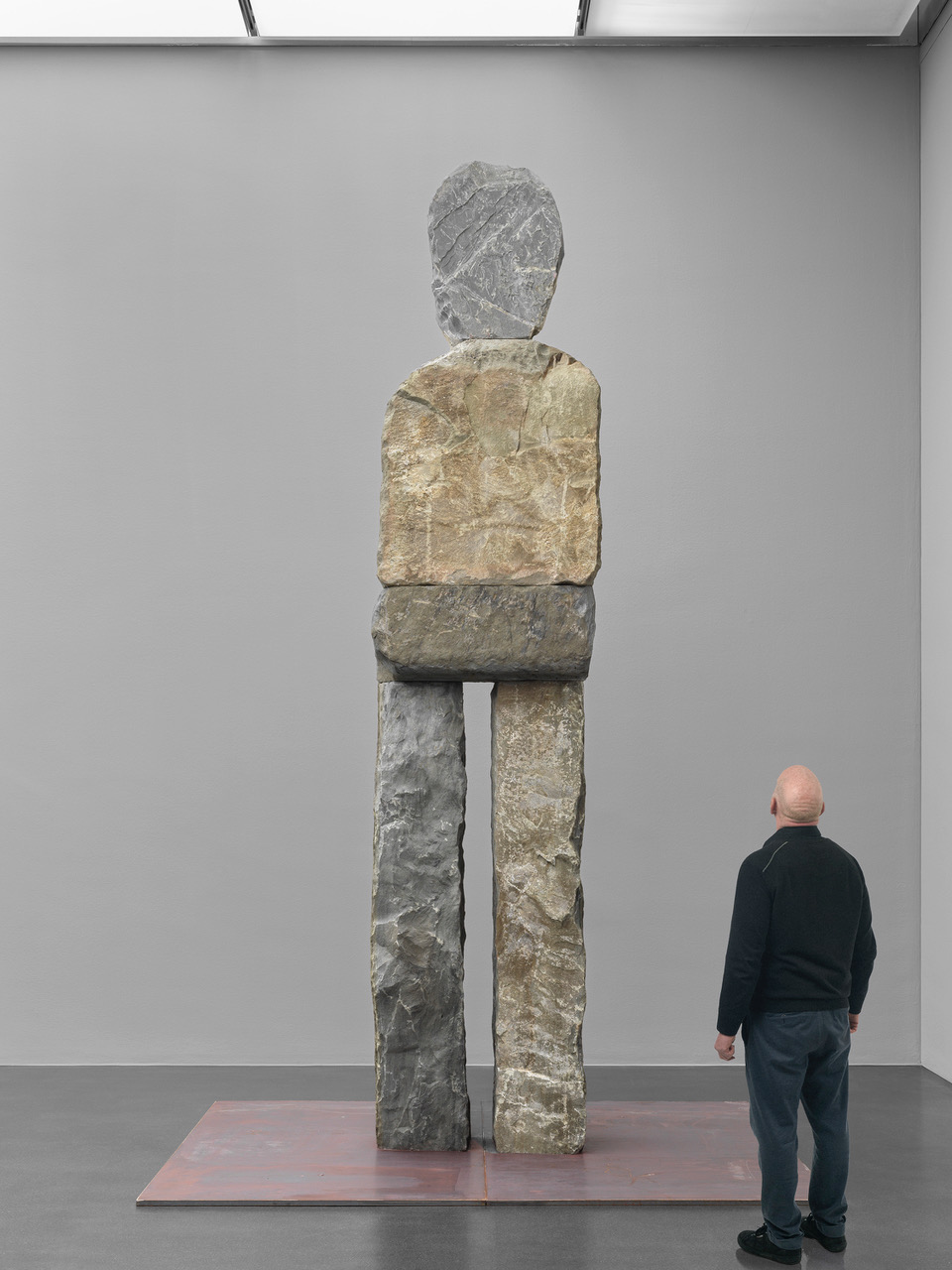 Ugo Rondinone,the innocent, 2024, Bluestone, stainless steel, concrete, 413 x 93 x 70 cm / 162 5/8 x 36 5/8 x 27 1/2 in. Courtesy the artist, Galerie Eva Presenhuber, Gladstone Gallery, and Mennour © Ugo Rondinone