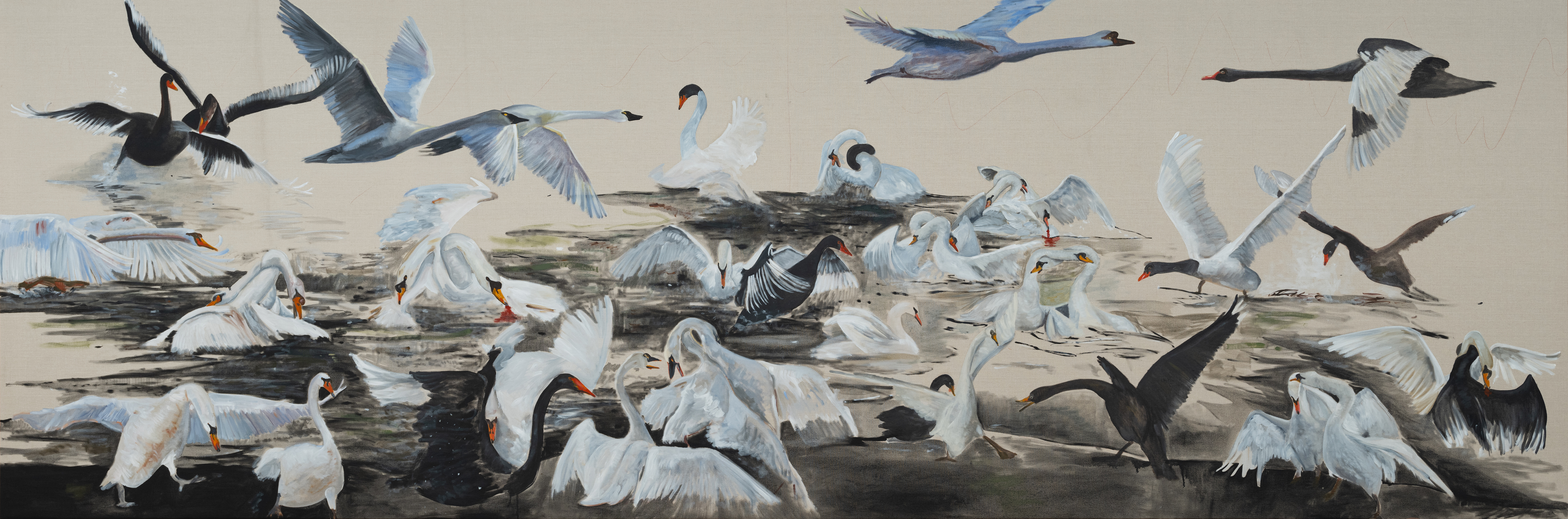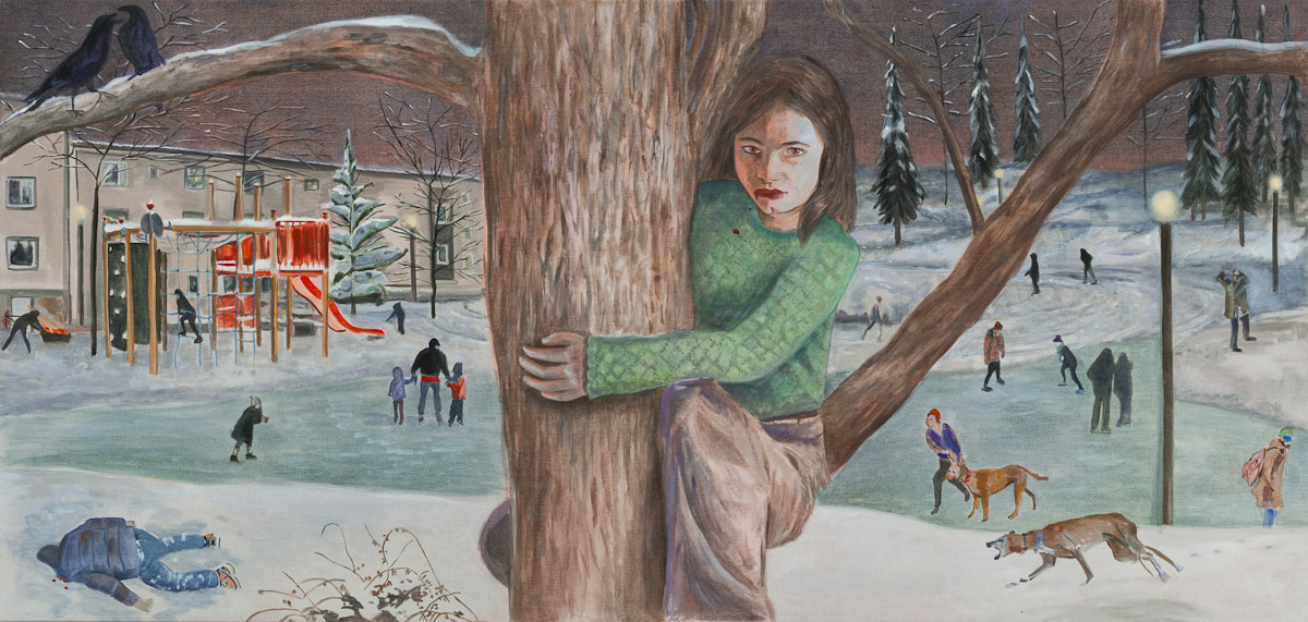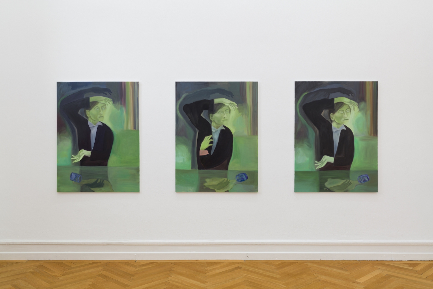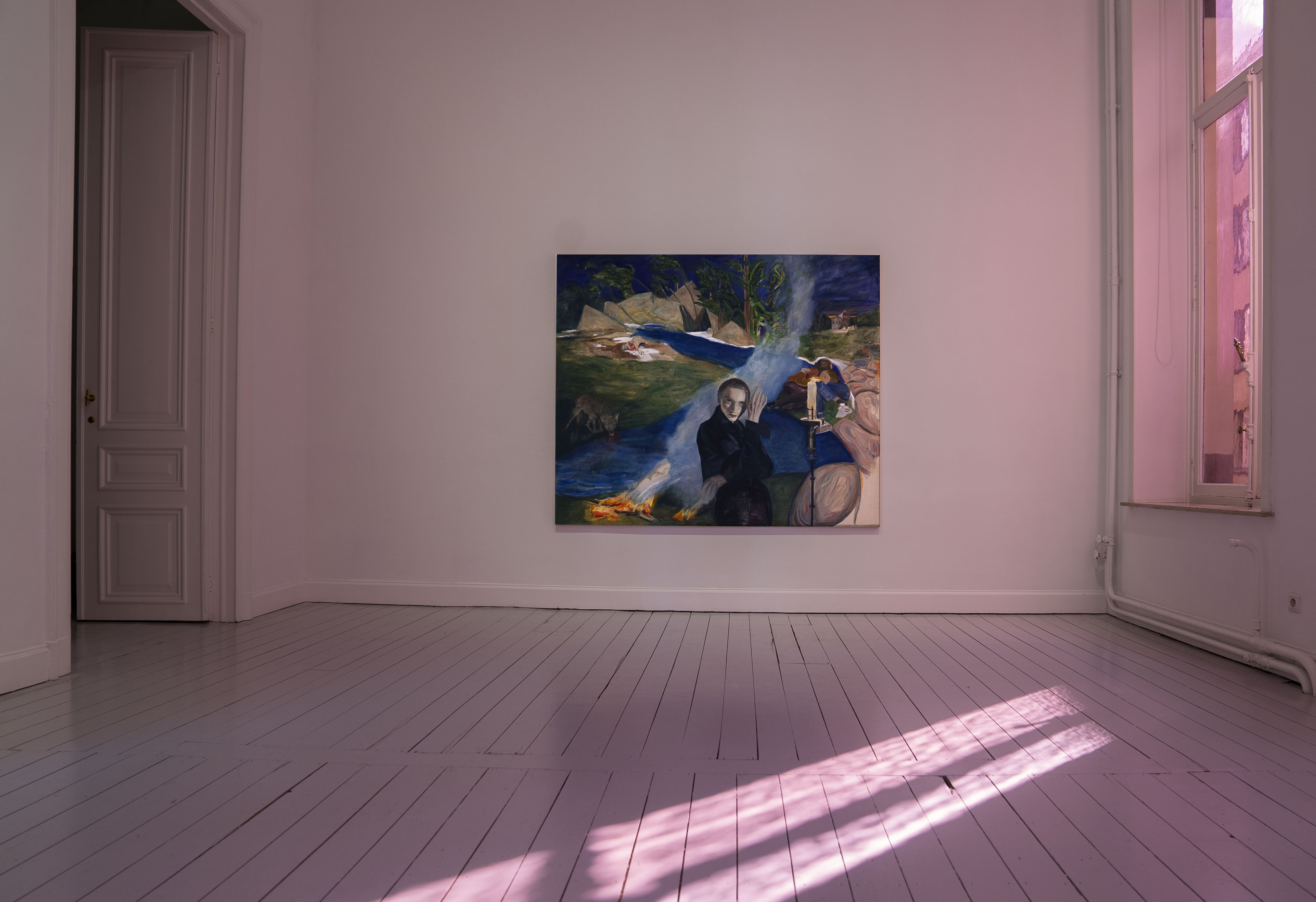 Jill Mulleady (b. 1980, Montevideo, Uruguay) is lives and works between Los Angeles and Paris. She works primarily in painting and she often intervenes in the spaces where she exhibits, staging the paintings with readymades, sculptures, and architectural installations, exploring themes of memory, transformation, and the power of history. In her work, references to historical painting are put into communication with images taken from both popular culture and personal life, creating an anachronic feeling of merged and frictional temporalities. Her practice shifts between close observations of everyday reality and highly elaborated imaginary worlds. These paintings can be seen as allegories for the contemporary experience of the image as an interface: not just a picture but a means of mobilizing attention, bodies and affects within an increasingly virtualized social space.