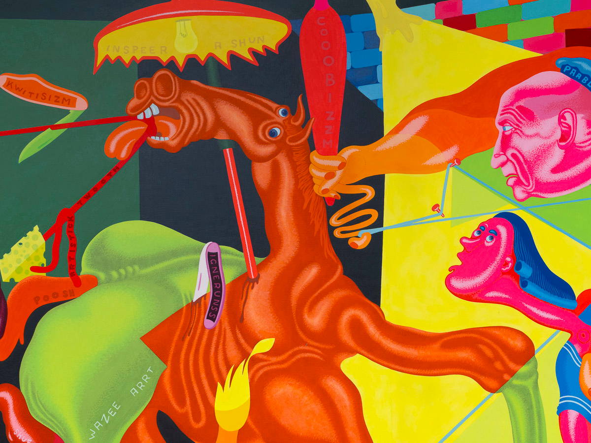 Peter Saul (b.1934, San Francisco, California) attended the California School of Fine Arts in San Francisco, and the Washington University School of Fine Arts in St. Louis. In 2020, the New Museum of Contemporary Art mounted “Peter Saul: Crime and Punishment,” the first retrospective of Peter Saul’s work in New York. In 2019, les Abattoirs, Toulouse presented “Peter Saul: Pop, Funk, Bad Painting, and More,” a major retrospective of Saul’s work, which traveled to Le Delta in Namur, Belgium. His work has been the subject of numerous international solo presentations, including recent exhibitions at the Deichtorhallen Hamburg; the Schirn Kunsthalle, Frankfurt; the Städtische Galerie Wolfsburg; The Arnold and Marie Schwartz Gallery Met, Metropolitan Opera House, Lincoln Center, New York; and the Fondation Salomon Art Contemporain, Alex. In 2008, his work was the subject of a traveling retrospective curated by Dan Cameron, which opened at the Orange County Museum of Art, Newport Beach, and traveled to the Pennsylvania Academy of Fine Arts, Philadelphia, and the Contemporary Arts Center New Orleans. An earlier retrospective of his work opened at the Musée de l’Hôtel Bertrand, Dole, in 1999, and traveled to the Musée des Beaux-Arts, Mons. Saul’s work is frequently featured in major group exhibitions at institutions both stateside and abroad, including recent presentations at the Crystal Bridges Museum of American Art, Bentonville; The Met Breuer, New York; the Sheldon Museum of Art, Lincoln; Kunsthalle Emden; the Brant Foundation Art Study Center, Greenwich; the New York Academy of Art; the Whitney Museum of American Art, New York; the Musée d’Art Contemporain, Marseille; the National Centre for Contemporary Arts, Moscow; MoMA PS1, Long Island City; the Rhode Island School of Design Museum, Providence; and the Wexner Center for the Arts, Columbus. His work is held in the permanent collections of numerous public institutions, including the Art Institute of Chicago; the Berkeley Art Museum and Pacific Film Archive; the Carnegie Institute, Pittsburgh, the Centre Georges Pompidou, Paris; the Dallas Museum of Art; the Los Angeles County Museum of Art; the Metropolitan Museum of Art, New York; Moderna Museet, Stockholm; the Museum of Modern Art, New York; the San Francisco Museum of Modern Art; the Smart Museum of Art at the University of Chicago; the Smithsonian American Art Museum, Washington, D.C.; the Stedelijk Museum, Amsterdam; the Yale University Art Gallery, New Haven; the Walker Art Center, Minneapolis; and the Whitney Museum of American Art, New York. In 1993, Saul received the John Simon Guggenheim Memorial Foundation Fellowship. In 2008, Saul received the Artist’s Foundation Legacy Award. In 2010, Saul was elected to the American Academy of Arts and Letters. Peter Saul lives and works in New York City and Germantown, New York.