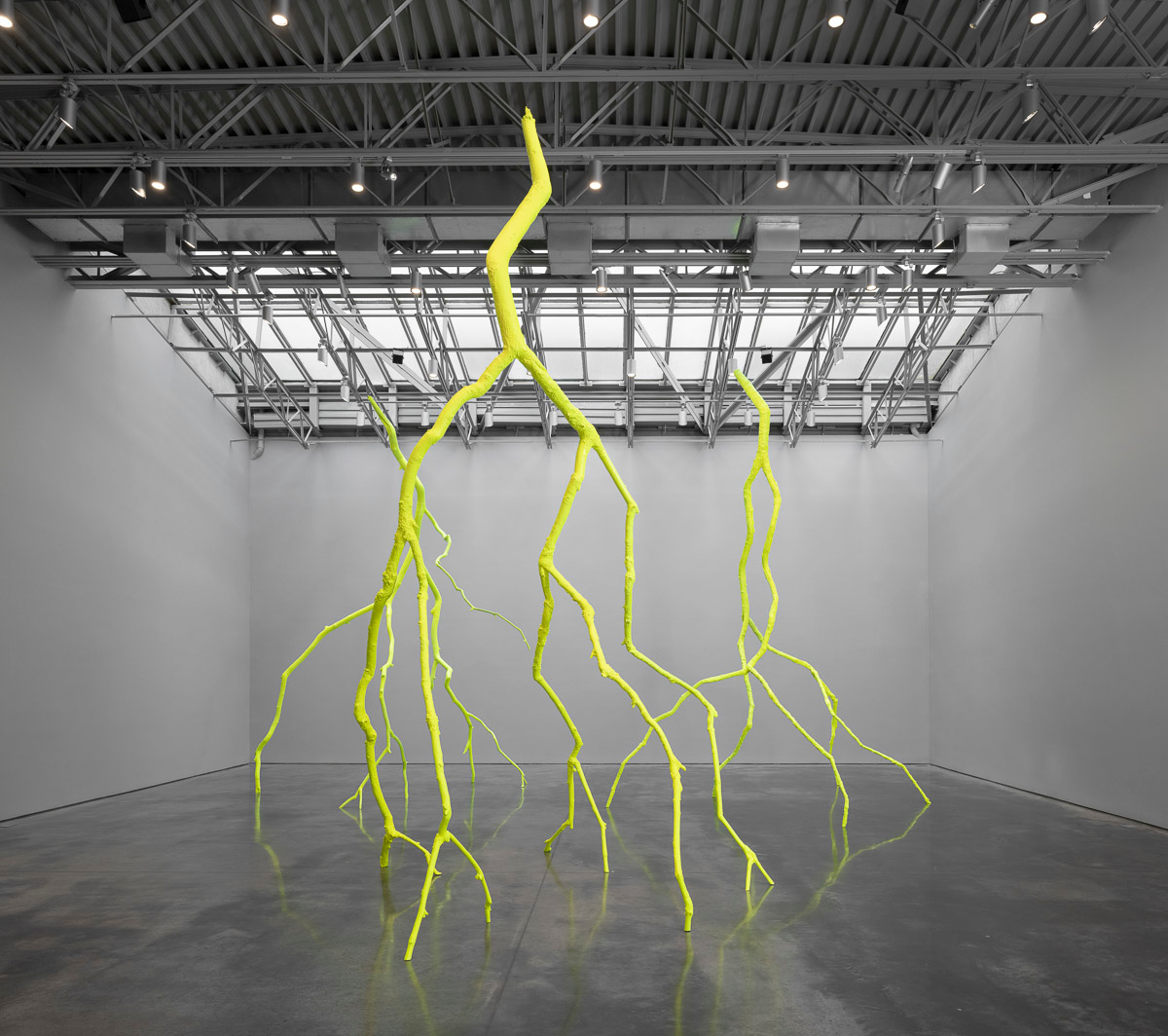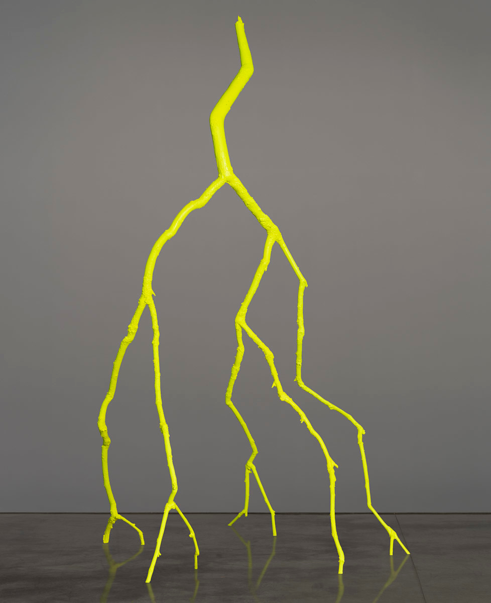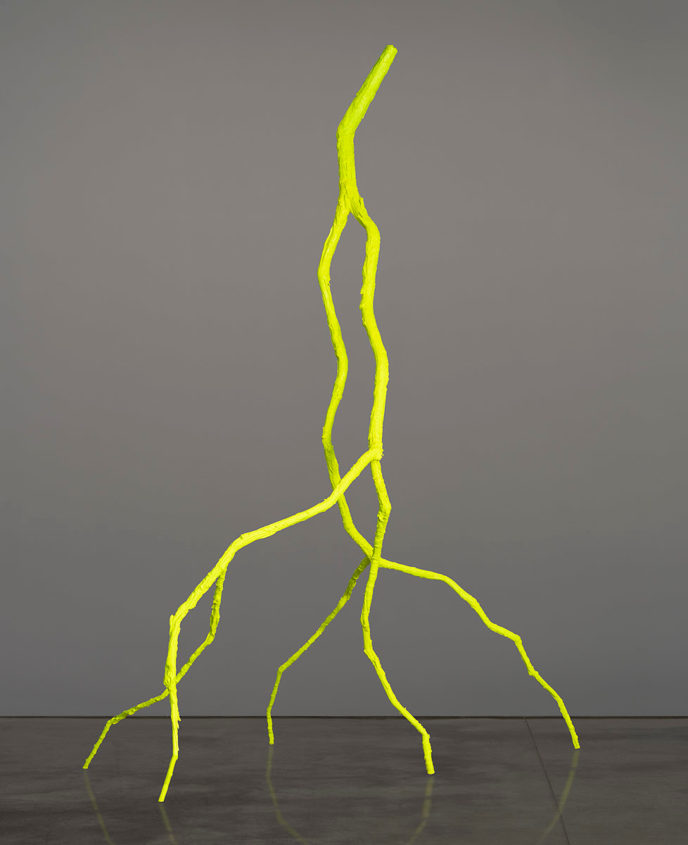 Gladstone is pleased to announce bright light shining, an exhibition by Ugo Rondinone. For this show, the artist presents new, large-scale sculptures along with an interconnected body of work, which act as building blocks of the perfect storm. In the center of the exhibition are three massive lightning strikes that forcefully punctuate the space. Painted in bright, dayglo yellow, the bronze light sculptures depict the crooked and rhythmic lines that form strikes of lightning, creating tangible and static representations of these miraculous experiences and awe-inspiring phenomena. A hung cloud relief created with sand, gravel, and concrete accompanies the light sculptures in the artist’s conjuring of environmental marvels. Using heavy elements borne directly from the earth, Rondinone suggests the interconnectedness of the materials that comprise both land and sky. As the viewer moves around the exhibition, each form continually changes based on the viewer’s vantage point. The conscientious selection of materiality in the works empowers a greater understanding of Rondinone’s experiential presentation. Connected here by towering lightning strikes and a weighty cloud, Rondinone freezes an inexplicable moment in time that captures the excitement, fear, and impending change brought on by environmental happenings, seemingly out of our control.
