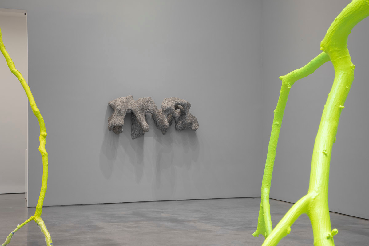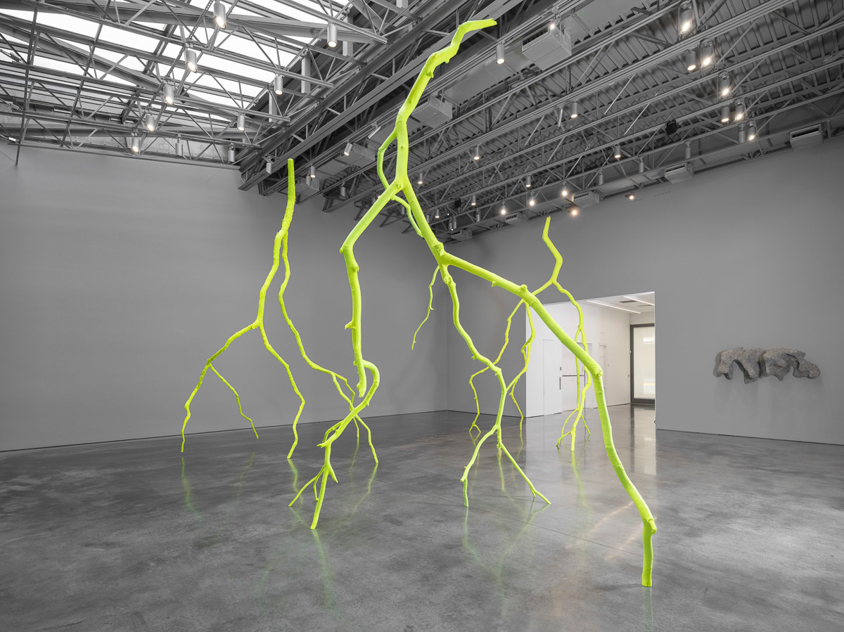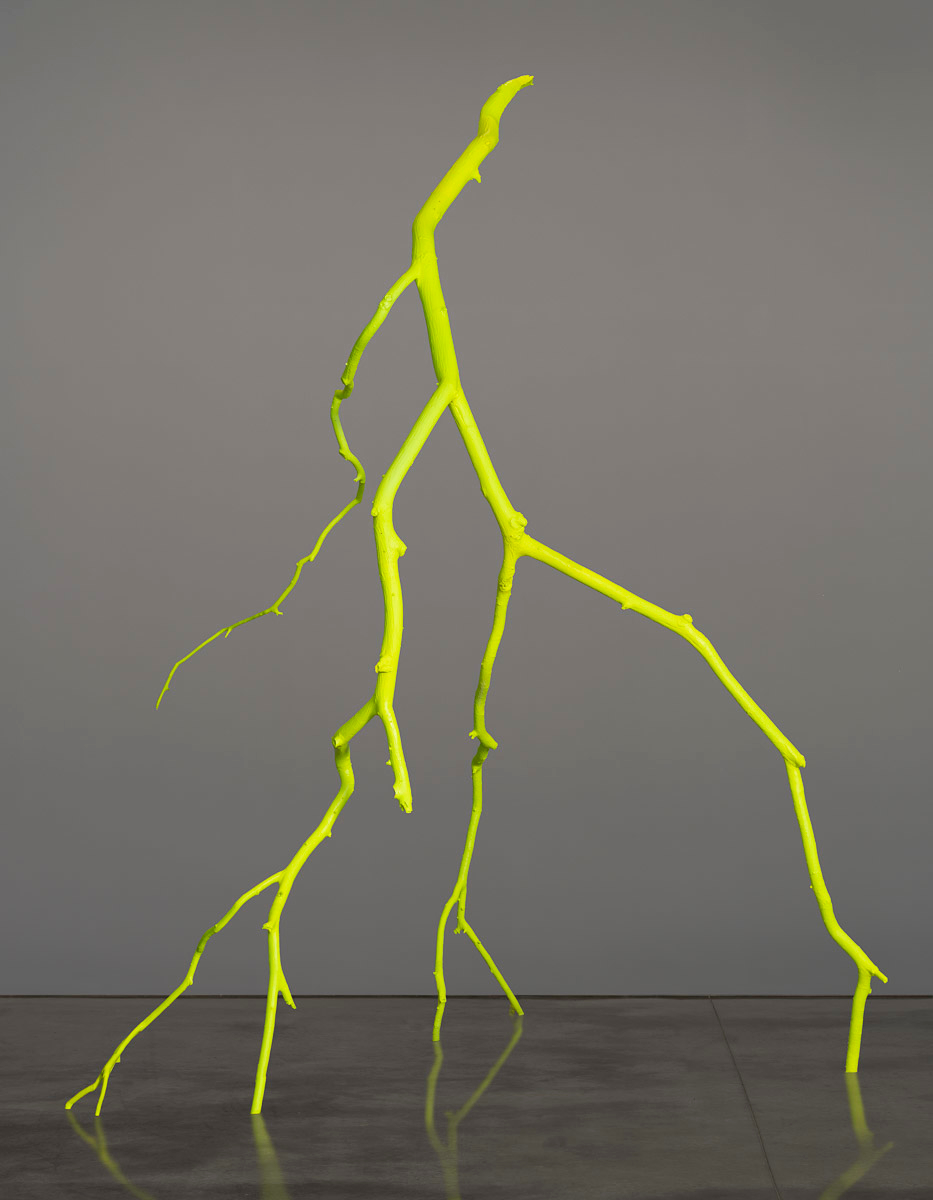 Gladstone is pleased to announce bright light shining, an exhibition by Ugo Rondinone. For this show, the artist presents new, large-scale sculptures along with an interconnected body of work, which act as building blocks of the perfect storm. In the center of the exhibition are three massive lightning strikes that forcefully punctuate the space. Painted in bright, dayglo yellow, the bronze light sculptures depict the crooked and rhythmic lines that form strikes of lightning, creating tangible and static representations of these miraculous experiences and awe-inspiring phenomena. A hung cloud relief created with sand, gravel, and concrete accompanies the light sculptures in the artist’s conjuring of environmental marvels. Using heavy elements borne directly from the earth, Rondinone suggests the interconnectedness of the materials that comprise both land and sky. As the viewer moves around the exhibition, each form continually changes based on the viewer’s vantage point. The conscientious selection of materiality in the works empowers a greater understanding of Rondinone’s experiential presentation. Connected here by towering lightning strikes and a weighty cloud, Rondinone freezes an inexplicable moment in time that captures the excitement, fear, and impending change brought on by environmental happenings, seemingly out of our control.