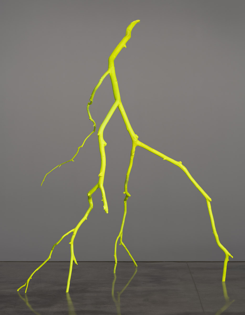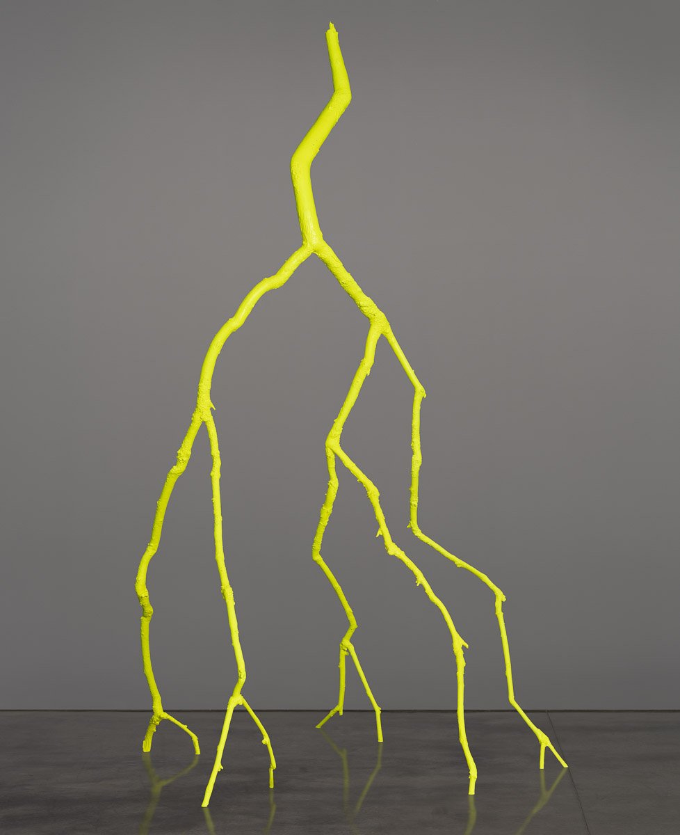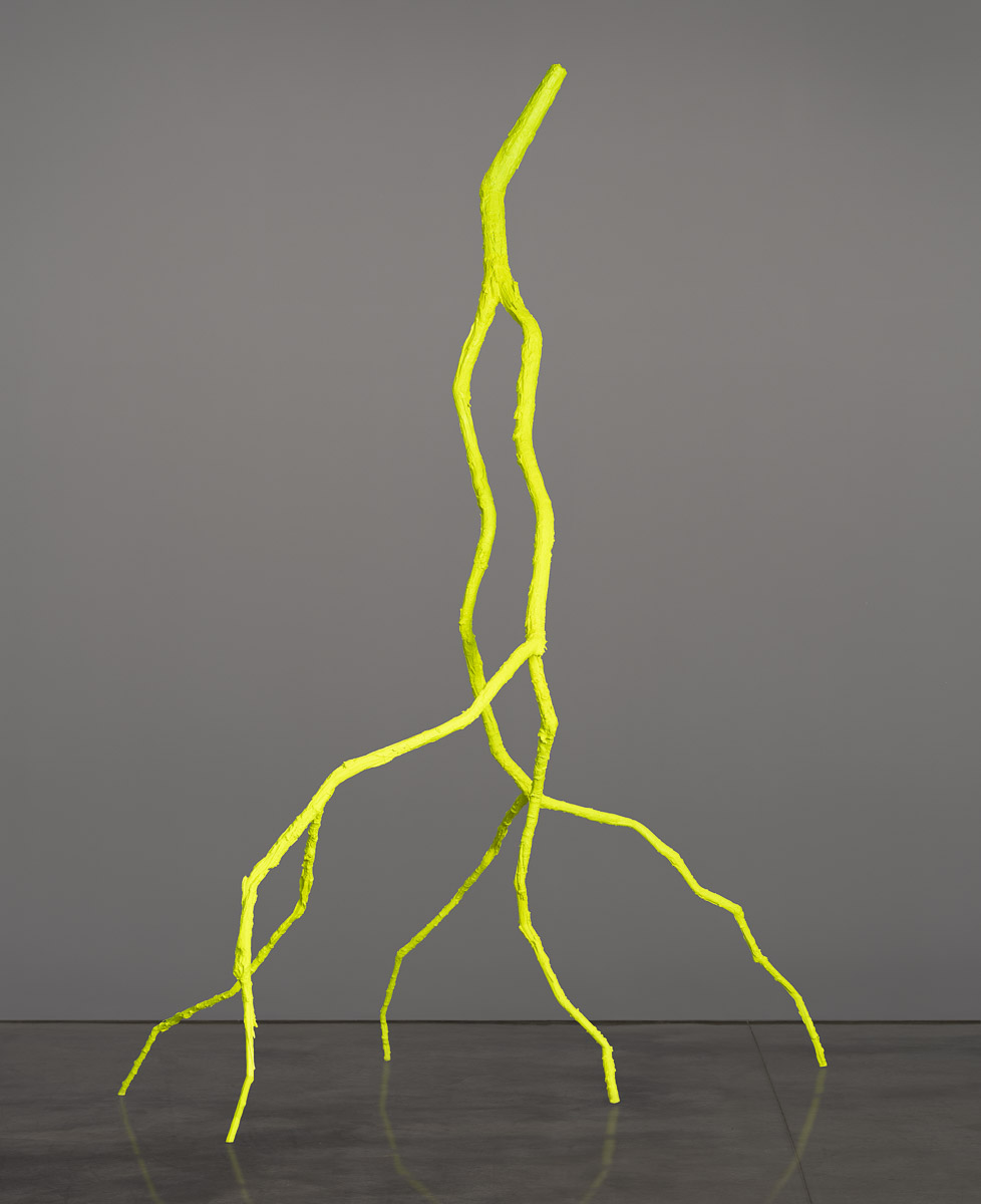 Gladstone is pleased to announce bright light shining, an exhibition by Ugo Rondinone. For this show, the artist presents new, large-scale sculptures along with an interconnected body of work, which act as building blocks of the perfect storm. In the center of the exhibition are three massive lightning strikes that forcefully punctuate the space. Painted in bright, dayglo yellow, the bronze light sculptures depict the crooked and rhythmic lines that form strikes of lightning, creating tangible and static representations of these miraculous experiences and awe-inspiring phenomena. A hung cloud relief created with sand, gravel, and concrete accompanies the light sculptures in the artist’s conjuring of environmental marvels. Using heavy elements borne directly from the earth, Rondinone suggests the interconnectedness of the materials that comprise both land and sky. As the viewer moves around the exhibition, each form continually changes based on the viewer’s vantage point. The conscientious selection of materiality in the works empowers a greater understanding of Rondinone’s experiential presentation. Connected here by towering lightning strikes and a weighty cloud, Rondinone freezes an inexplicable moment in time that captures the excitement, fear, and impending change brought on by environmental happenings, seemingly out of our control.