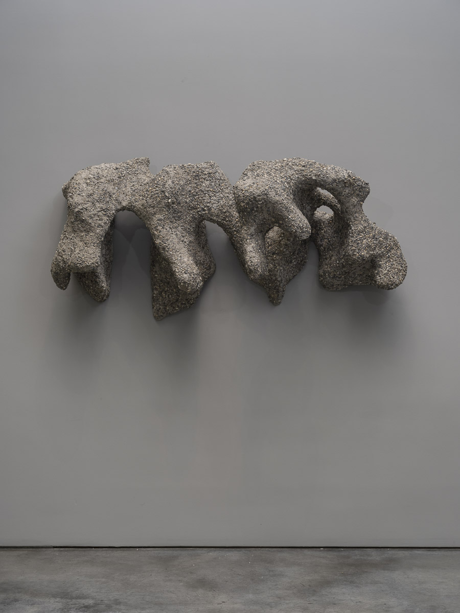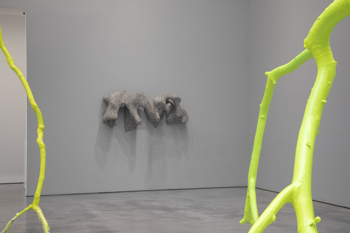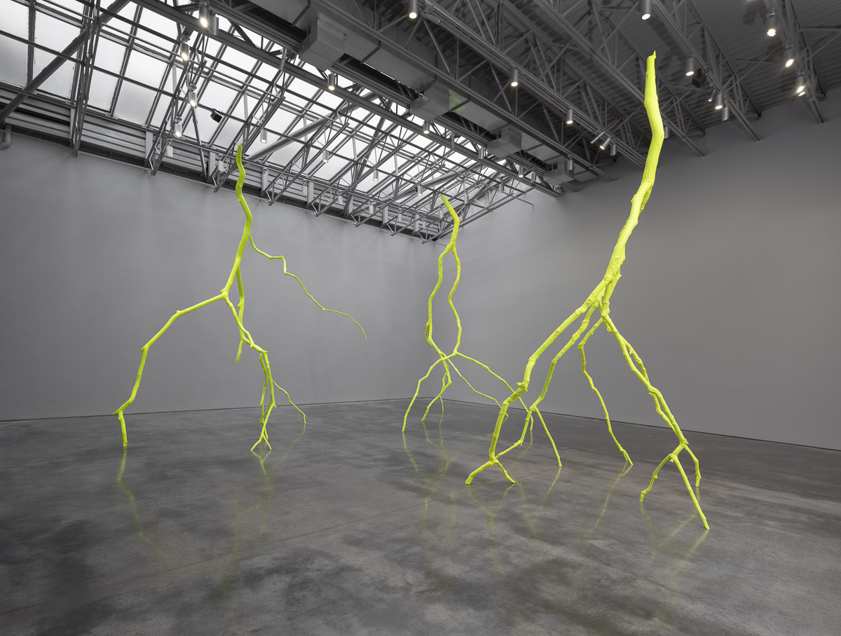 Gladstone is pleased to announce bright light shining, an exhibition by Ugo Rondinone. For this show, the artist presents new, large-scale sculptures along with an interconnected body of work, which act as building blocks of the perfect storm. In the center of the exhibition are three massive lightning strikes that forcefully punctuate the space. Painted in bright, dayglo yellow, the bronze light sculptures depict the crooked and rhythmic lines that form strikes of lightning, creating tangible and static representations of these miraculous experiences and awe-inspiring phenomena. A hung cloud relief created with sand, gravel, and concrete accompanies the light sculptures in the artist’s conjuring of environmental marvels. Using heavy elements borne directly from the earth, Rondinone suggests the interconnectedness of the materials that comprise both land and sky. As the viewer moves around the exhibition, each form continually changes based on the viewer’s vantage point. The conscientious selection of materiality in the works empowers a greater understanding of Rondinone’s experiential presentation. Connected here by towering lightning strikes and a weighty cloud, Rondinone freezes an inexplicable moment in time that captures the excitement, fear, and impending change brought on by environmental happenings, seemingly out of our control.