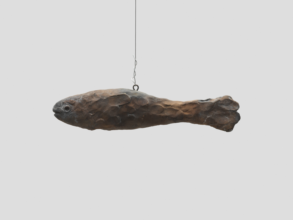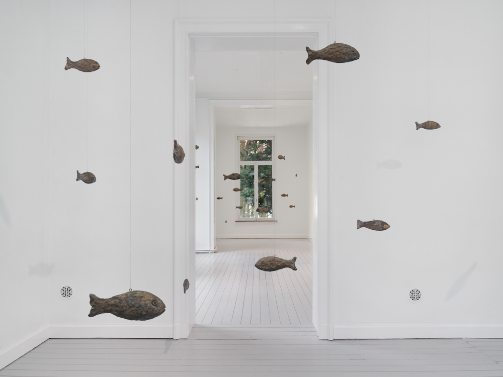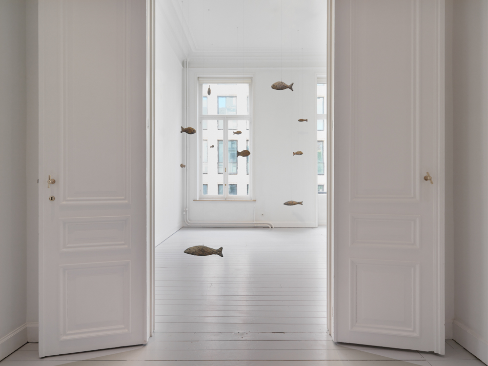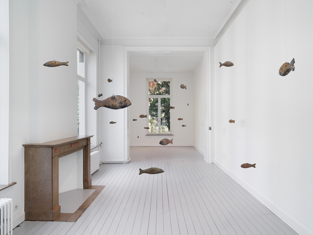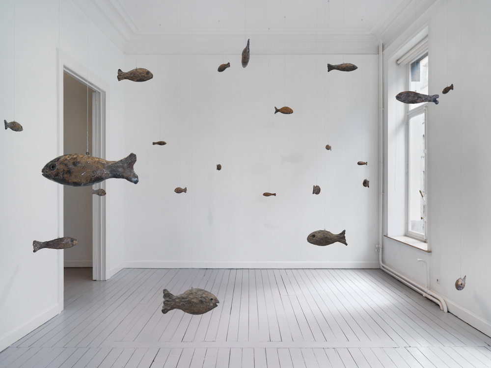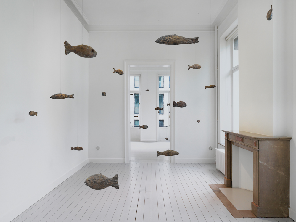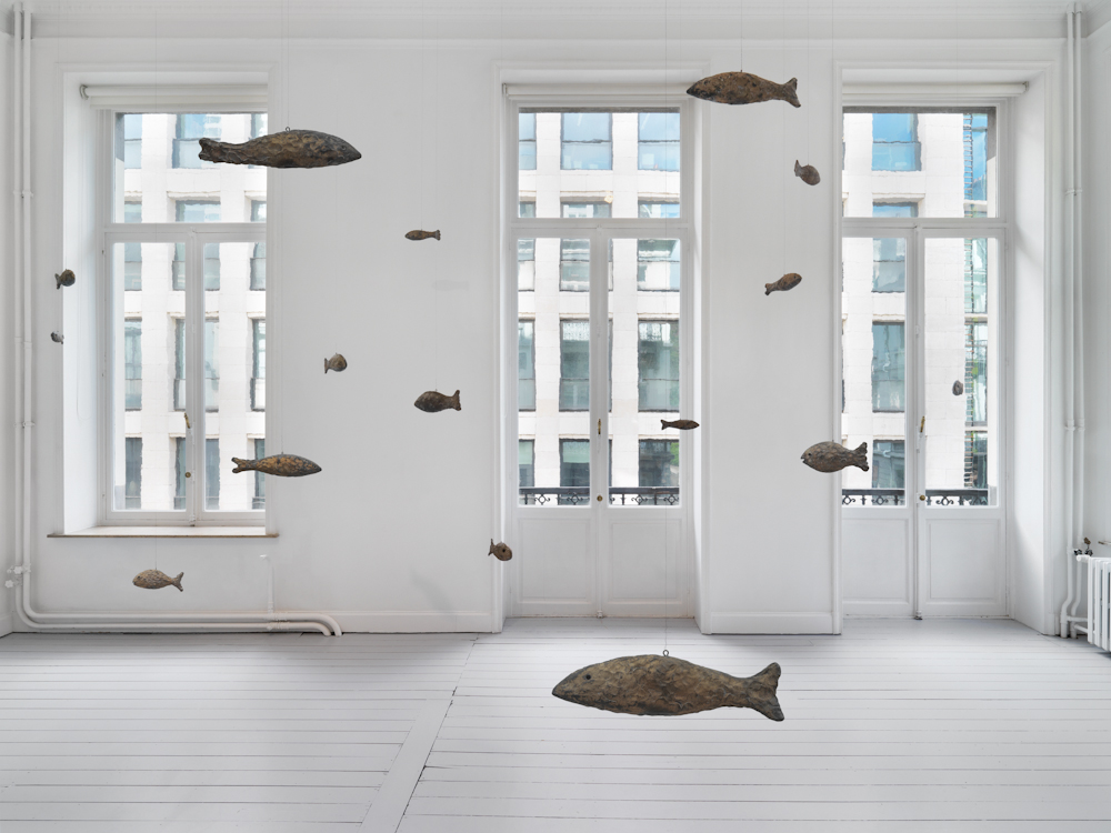Gladstone is pleased to present primordial, an exhibition of new works by Ugo Rondinone. Within the Brussels gallery space, Rondinone creates another universe with forty-seven sculptures: each form is named after a natural phenomenon and embodied by a bronze fish suspended on wire. These sculptures follow in a series that includes bronze-cast birds (primitive, 2011) and horses (primal, 2013). Rondinone’s three groupings of animals stand in for the world beyond the exhibition space, representing the transience and temporality of the natural world. This menagerie of forms belonging to air, land, and water represents timeless occurrences within the cosmos while demonstrating infinite reincarnations.