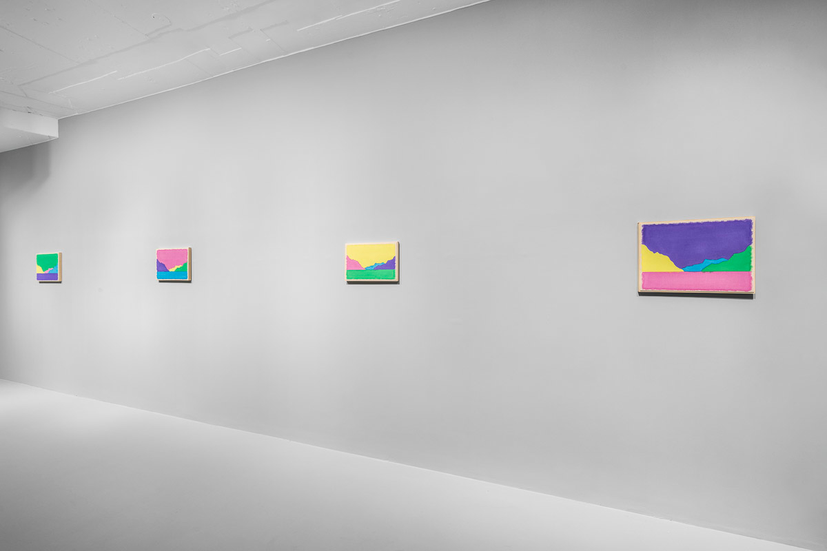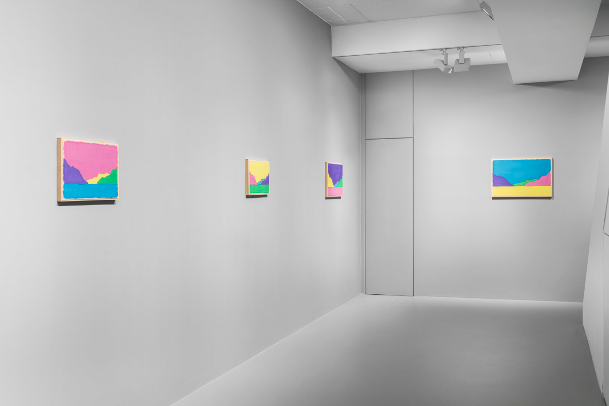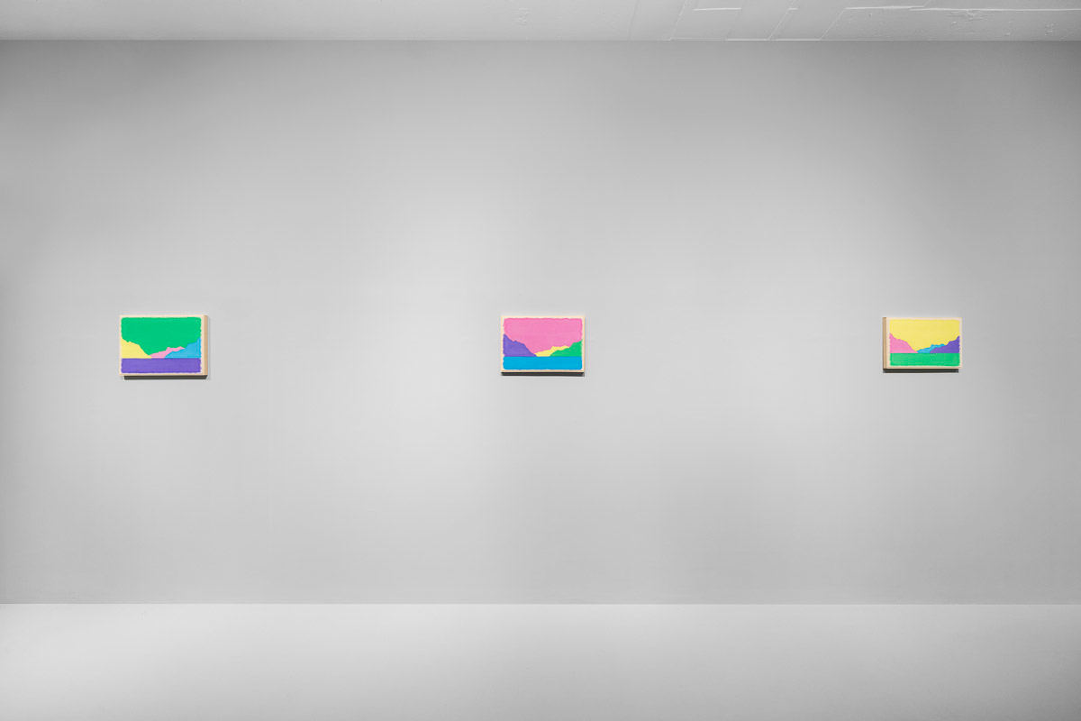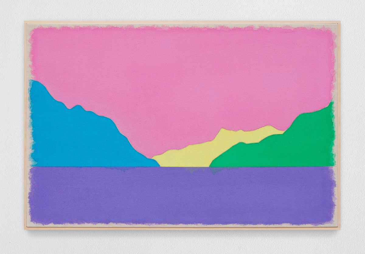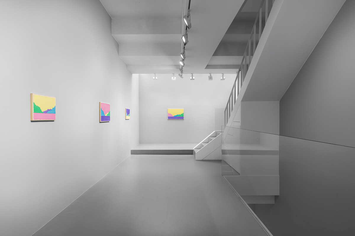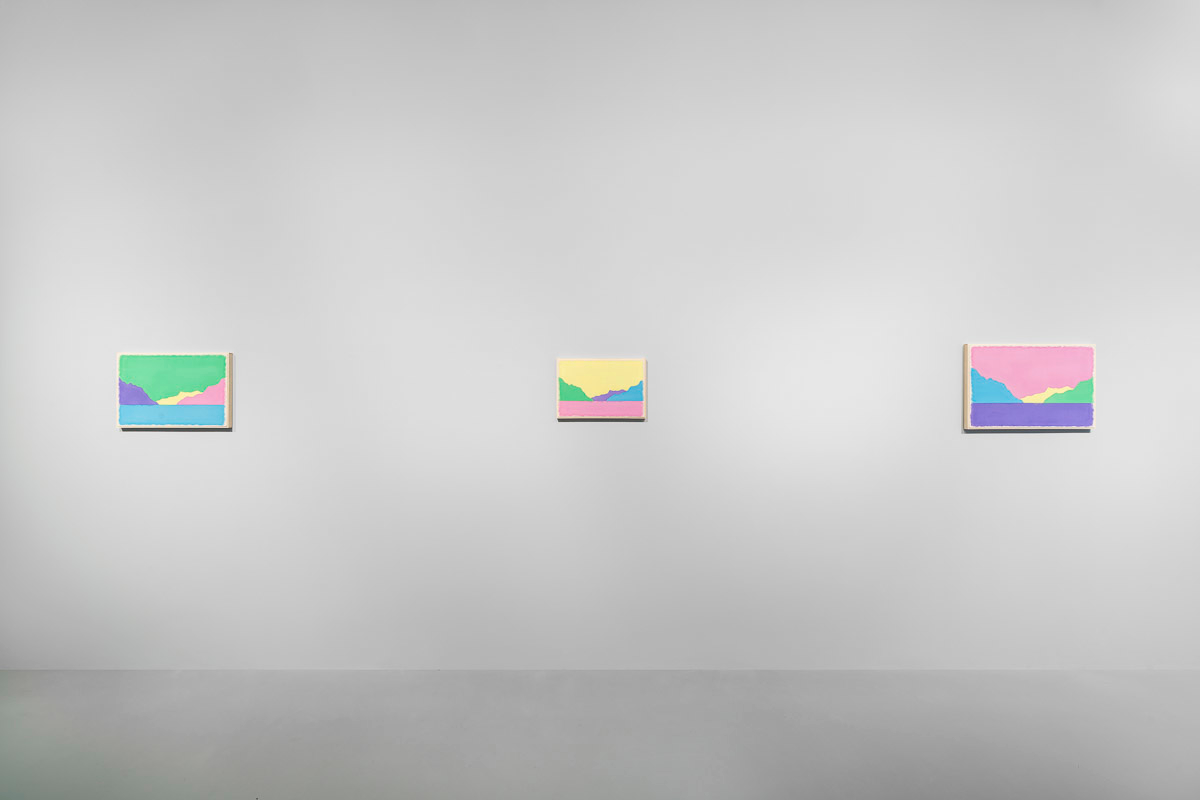 Gladstone is pleased to present in beauty bright, its first exhibition by Ugo Rondinone in Seoul. On view from August 29 to October 18, the show features thirteen new landscapes in various sizes. Each work is a watercolor on canvas in its own arrangement of the same five pastel shades—pink, blue, yellow, purple, and green. Otherwise, the compositions are identical, using only four lines to depict a mountain lake.