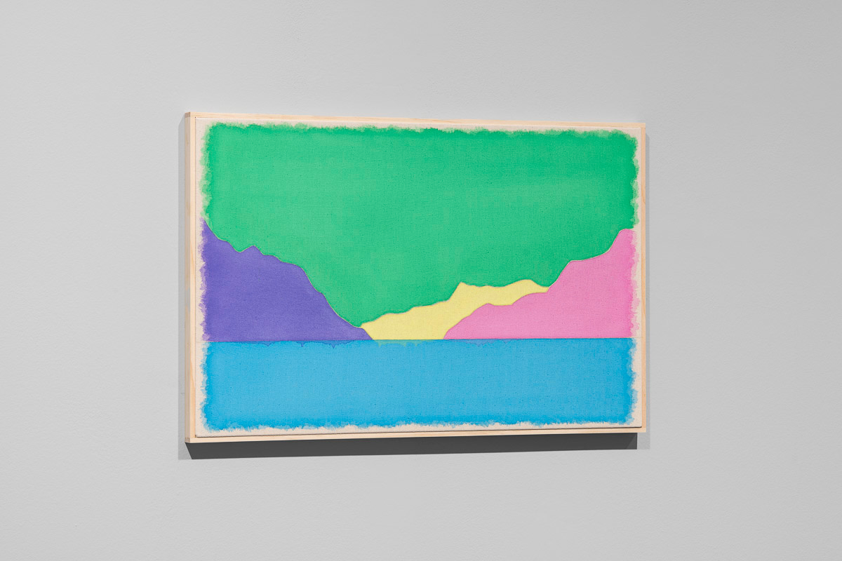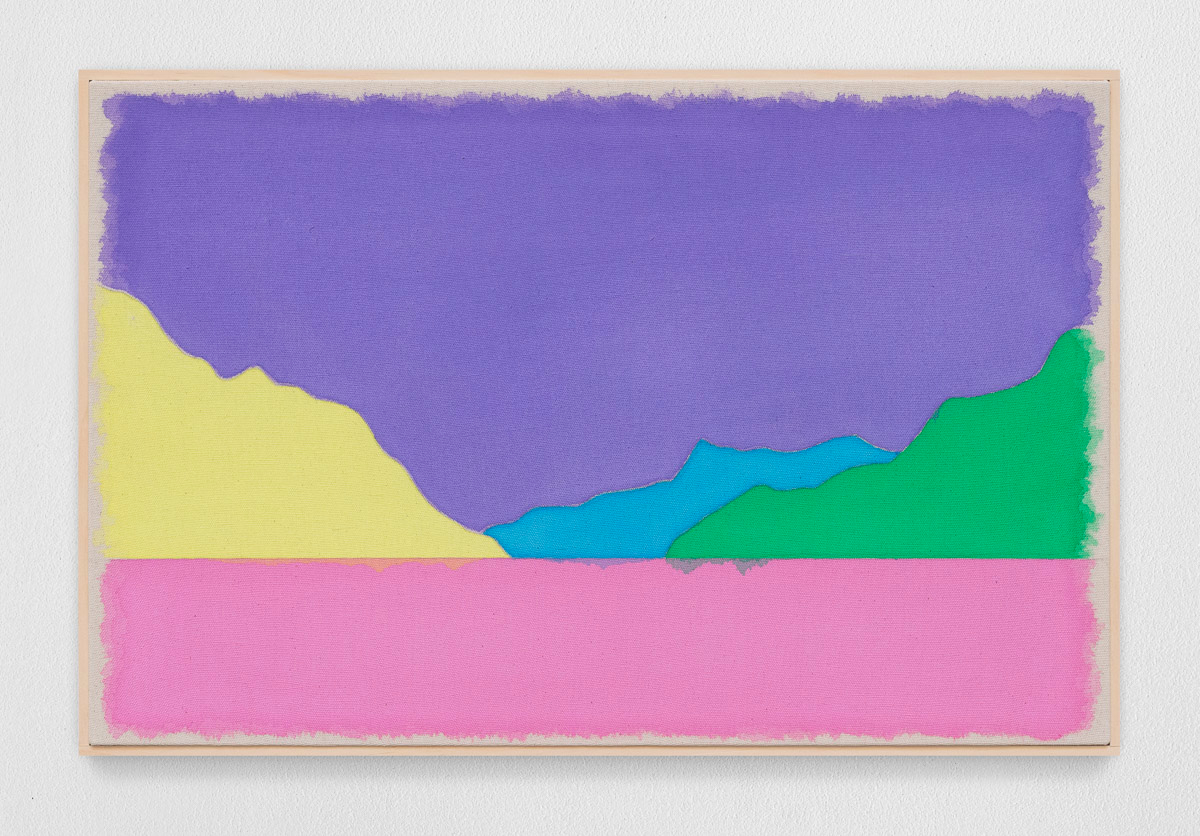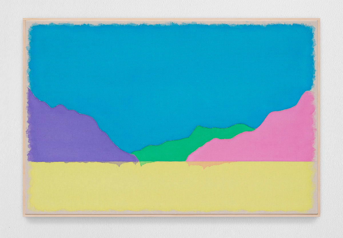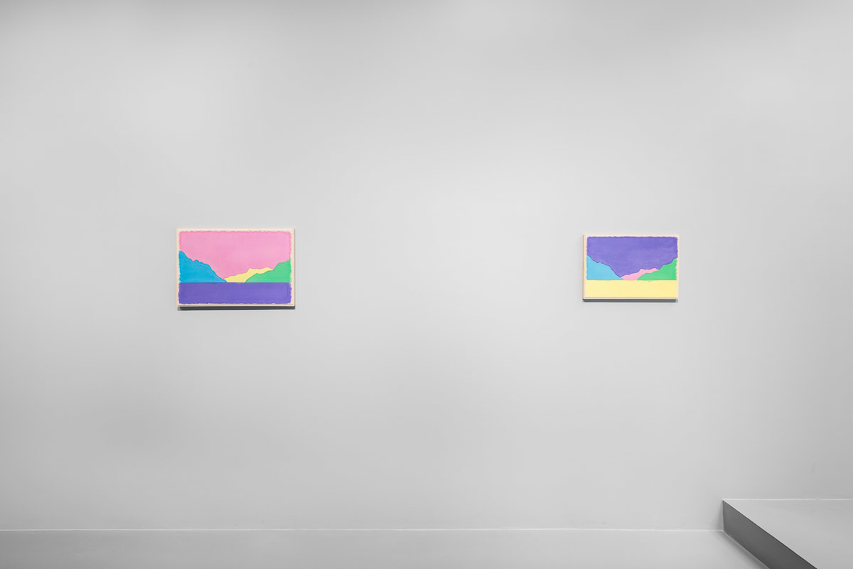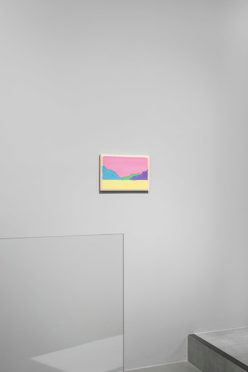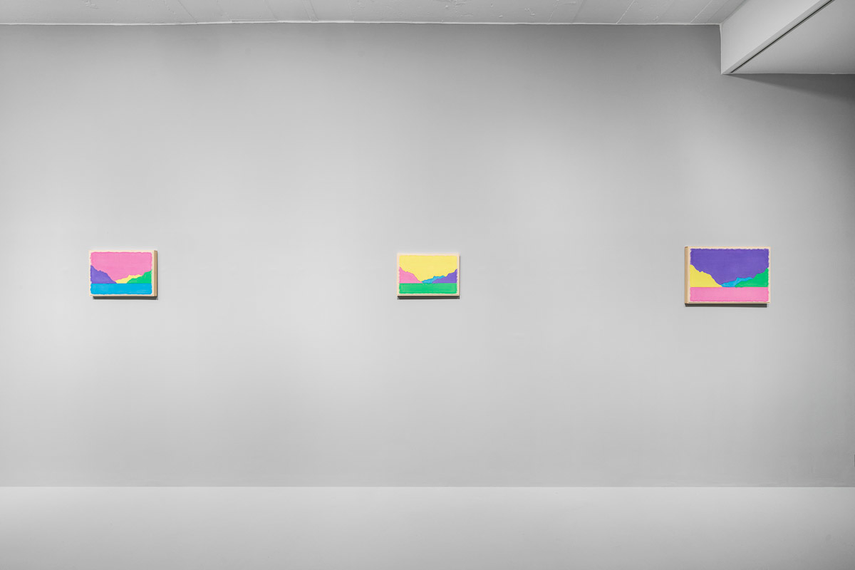 Gladstone is pleased to present in beauty bright, its first exhibition by Ugo Rondinone in Seoul. On view from August 29 to October 18, the show features thirteen new landscapes in various sizes. Each work is a watercolor on canvas in its own arrangement of the same five pastel shades—pink, blue, yellow, purple, and green. Otherwise, the compositions are identical, using only four lines to depict a mountain lake.