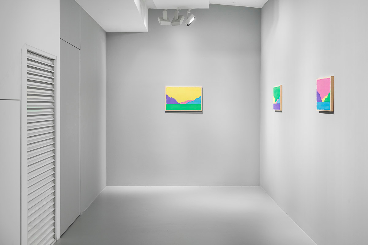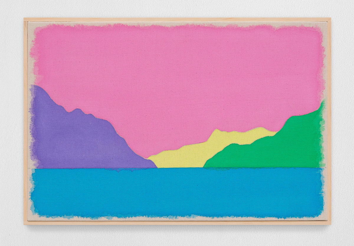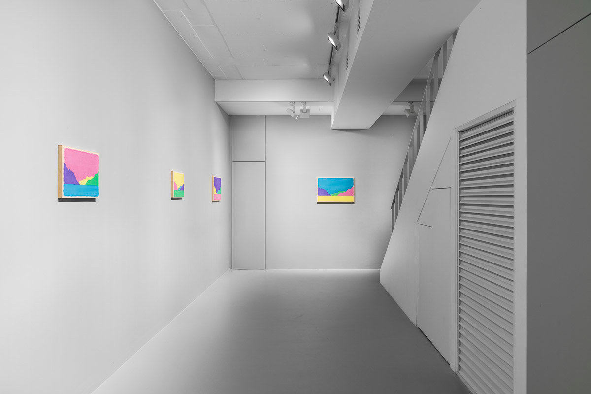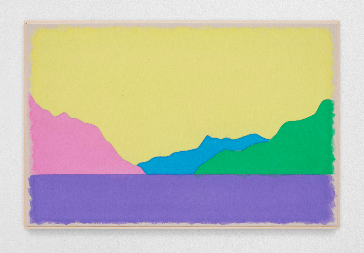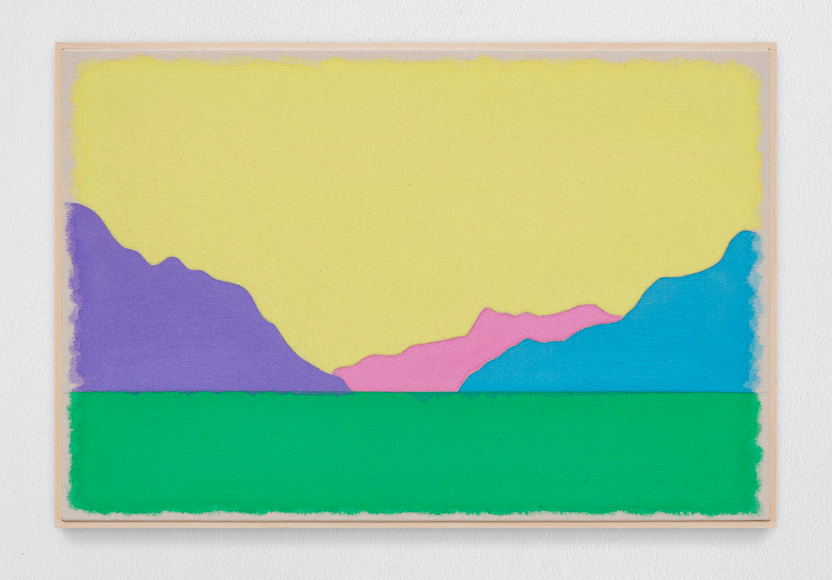 Gladstone is pleased to present in beauty bright, its first exhibition by Ugo Rondinone in Seoul. On view from August 29 to October 18, the show features thirteen new landscapes in various sizes. Each work is a watercolor on canvas in its own arrangement of the same five pastel shades—pink, blue, yellow, purple, and green. Otherwise, the compositions are identical, using only four lines to depict a mountain lake.