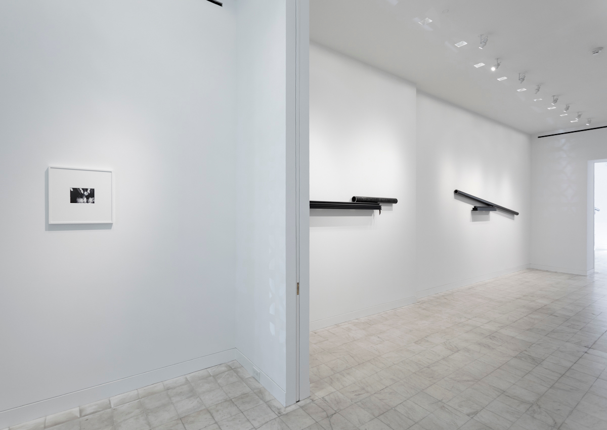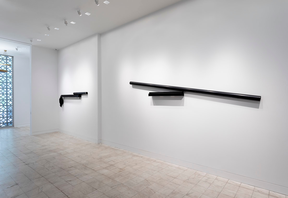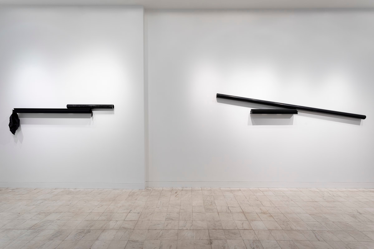 The host of unlikely marriages, transposed identities, and disparate doppelgangers that populate Arthur Jafa’s oeuvre come to full clarity in his new body of sculptures. Composed of industrial materials such as rubber tubing, aluminum beams, and steel pipes that are embellished with lengths of fur, chains, feathers and languidly draped bags, these objects reckon with the instrumentalization of the black body while shielding it with sartorial excess. Alluding to what Jafa calls “glamouring,” these sculptures simultaneously reference the burdensome machinations of double consciousness while also contending with the duplicity synonymous with glamour itself.