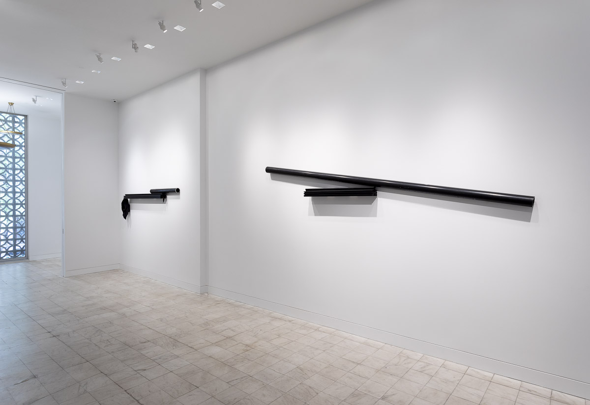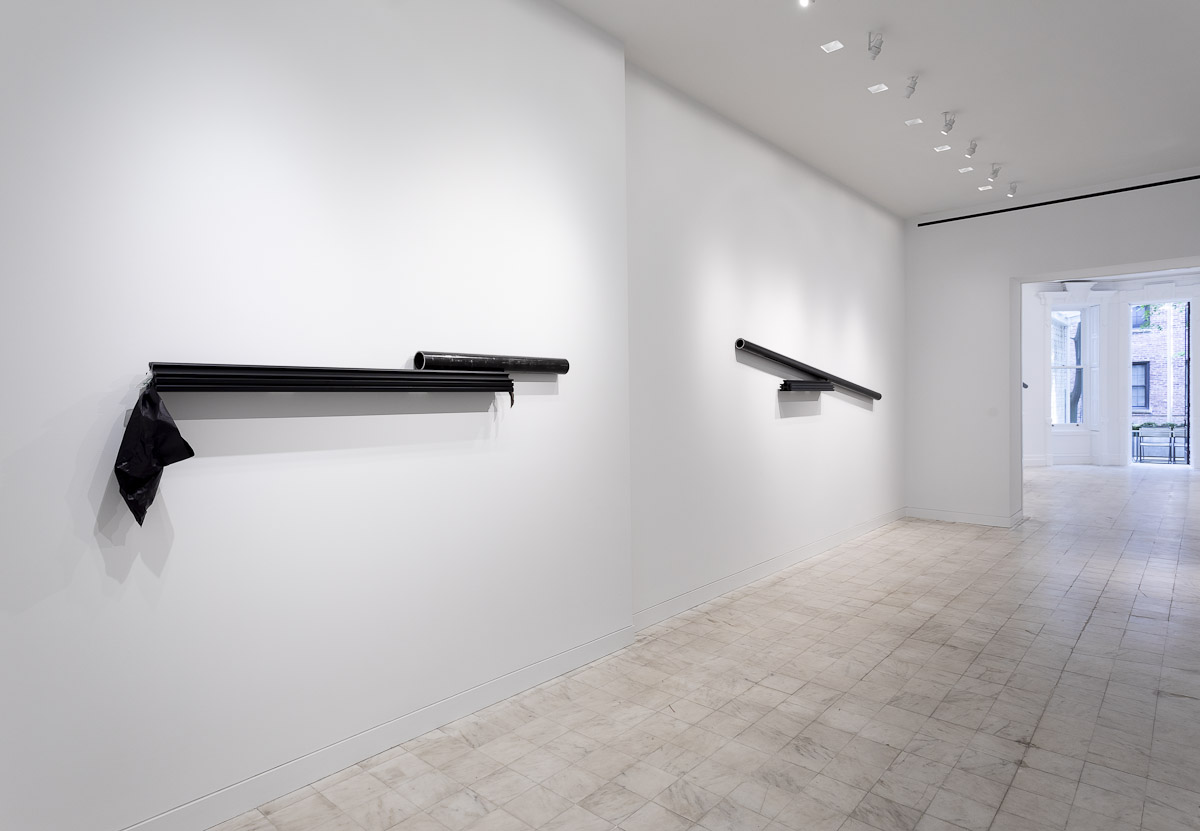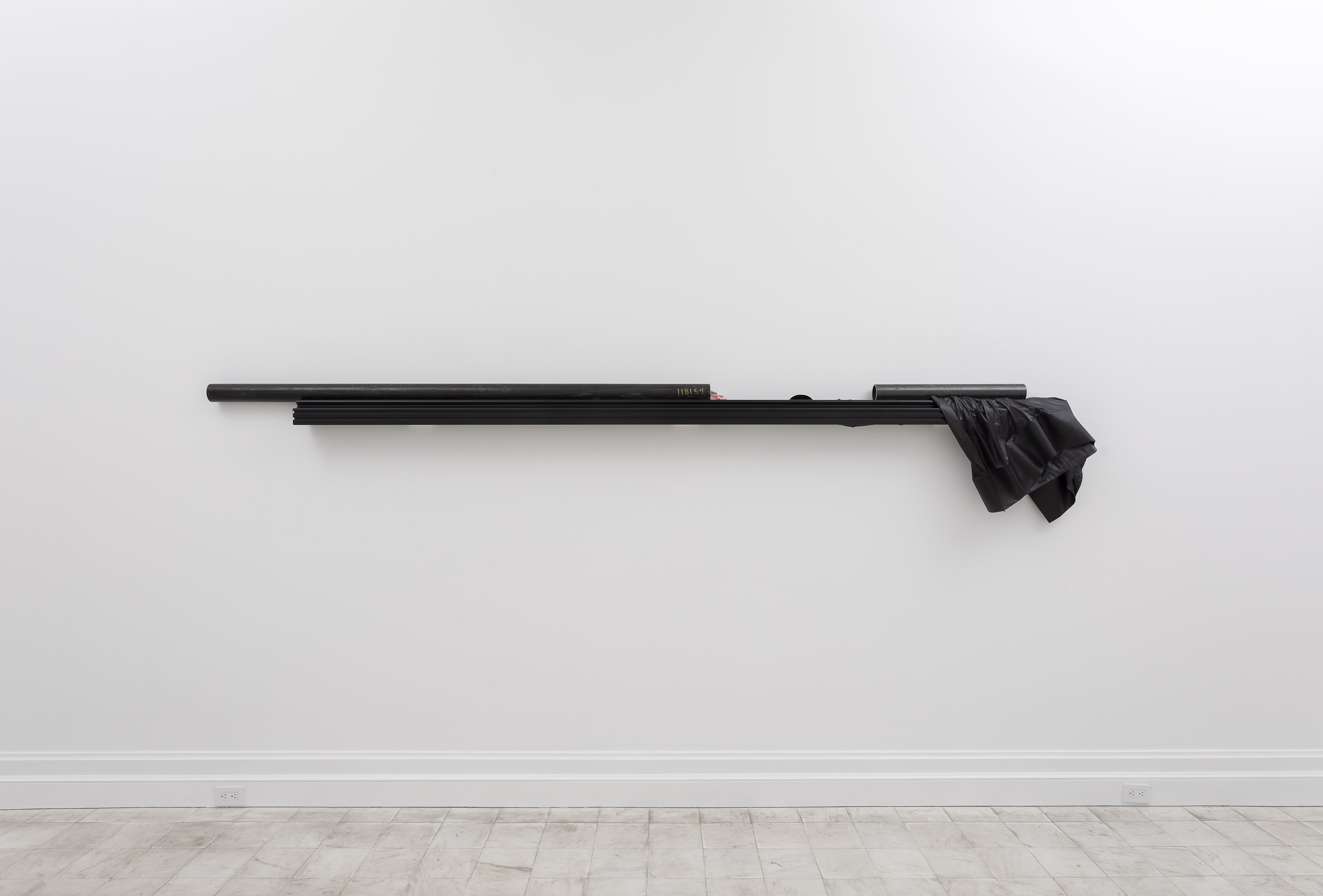 The host of unlikely marriages, transposed identities, and disparate doppelgangers that populate Arthur Jafa’s oeuvre come to full clarity in his new body of sculptures. Composed of industrial materials such as rubber tubing, aluminum beams, and steel pipes that are embellished with lengths of fur, chains, feathers and languidly draped bags, these objects reckon with the instrumentalization of the black body while shielding it with sartorial excess. Alluding to what Jafa calls “glamouring,” these sculptures simultaneously reference the burdensome machinations of double consciousness while also contending with the duplicity synonymous with glamour itself.