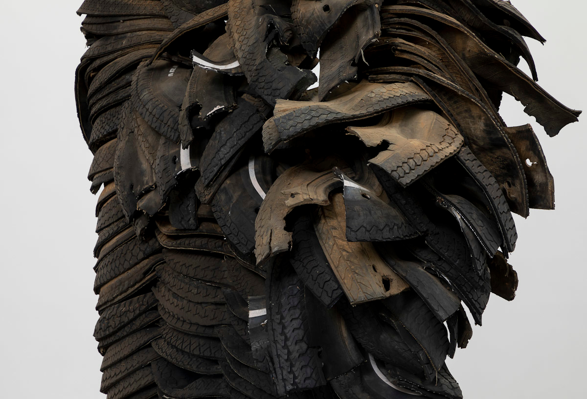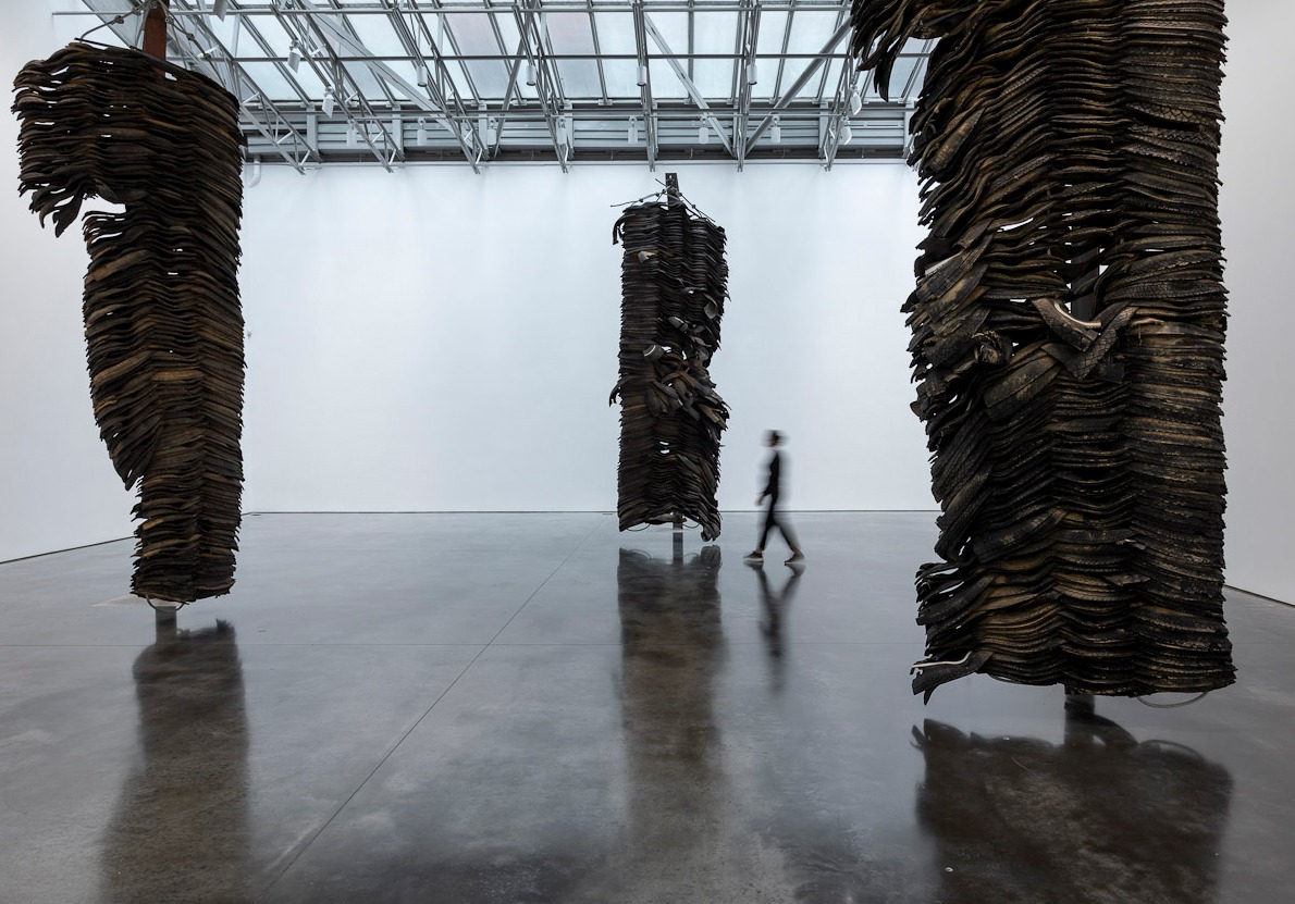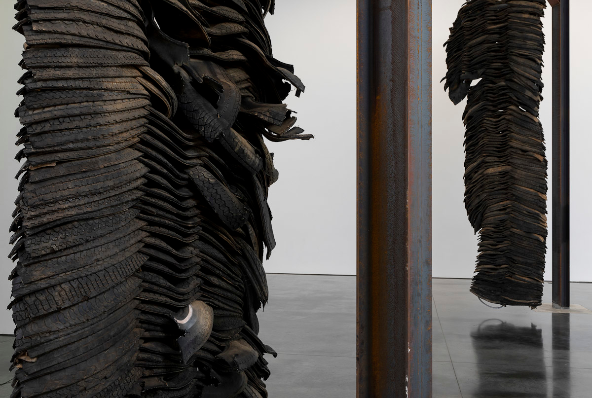 Blasting mats, for those unfamiliar, are heavy-duty mats stitched together from pieces of car tire, devised to catch flyrock from controlled explosions. Fifteen years ago, Richard Prince started making work from disused blasting mats, suspending them from customized frames at his studio in Rensselaerville. A trio of these sculptures, Untitled (Blasting Mats) (2006) are transposed to a gallery for the first time. They hang, slumped and heavy, from metal I-beams, structures with unforgiving, murderous associations.