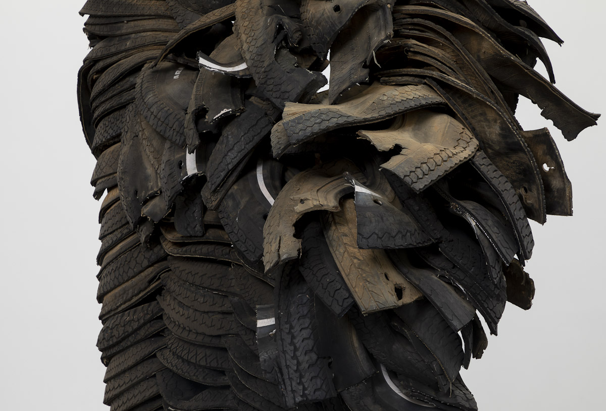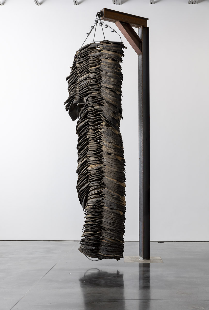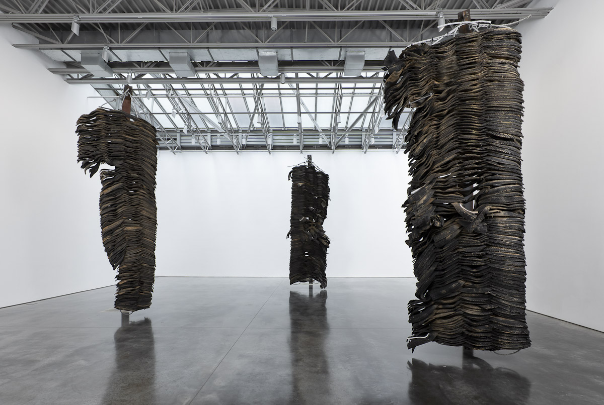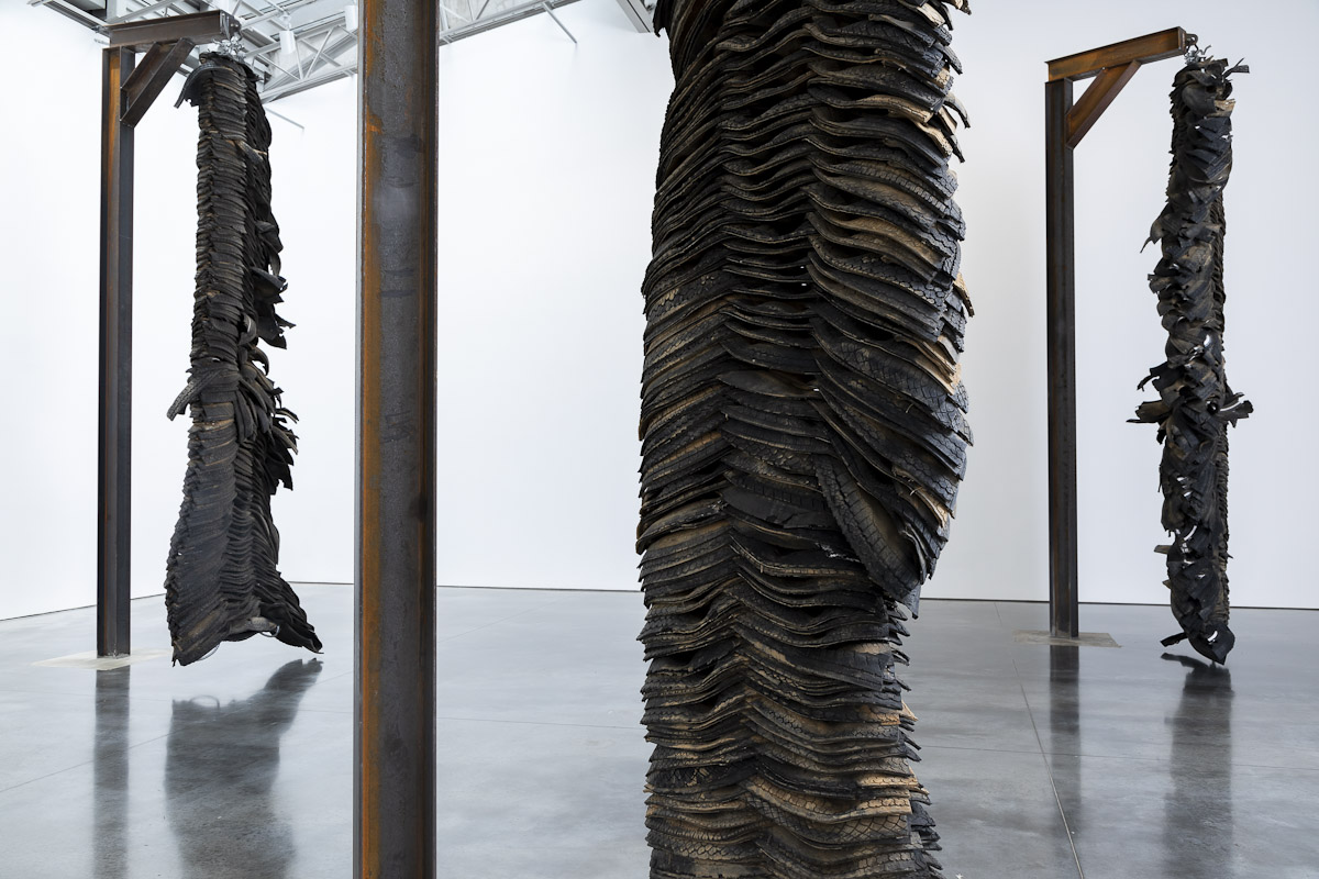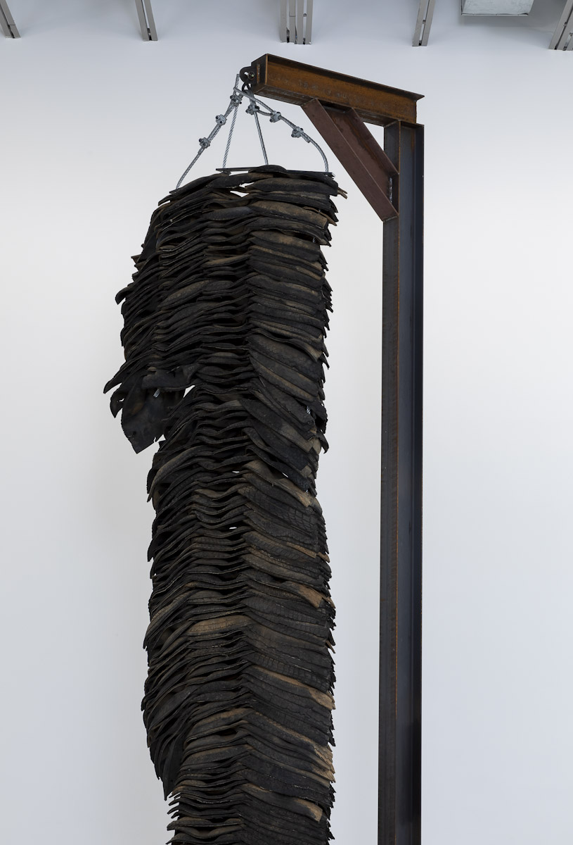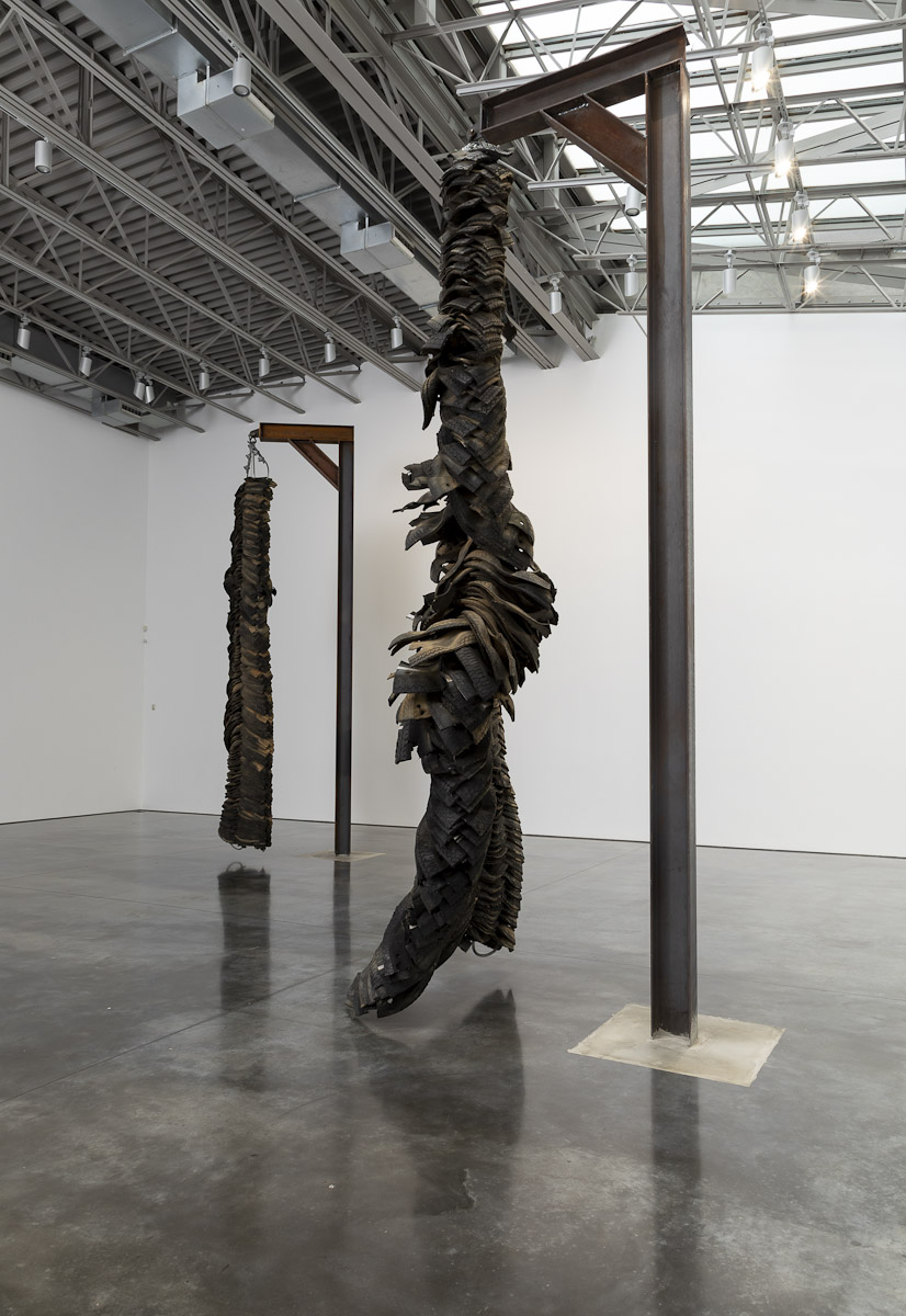 Blasting mats, for those unfamiliar, are heavy-duty mats stitched together from pieces of car tire, devised to catch flyrock from controlled explosions. Fifteen years ago, Richard Prince started making work from disused blasting mats, suspending them from customized frames at his studio in Rensselaerville. A trio of these sculptures, Untitled (Blasting Mats) (2006) are transposed to a gallery for the first time. They hang, slumped and heavy, from metal I-beams, structures with unforgiving, murderous associations.