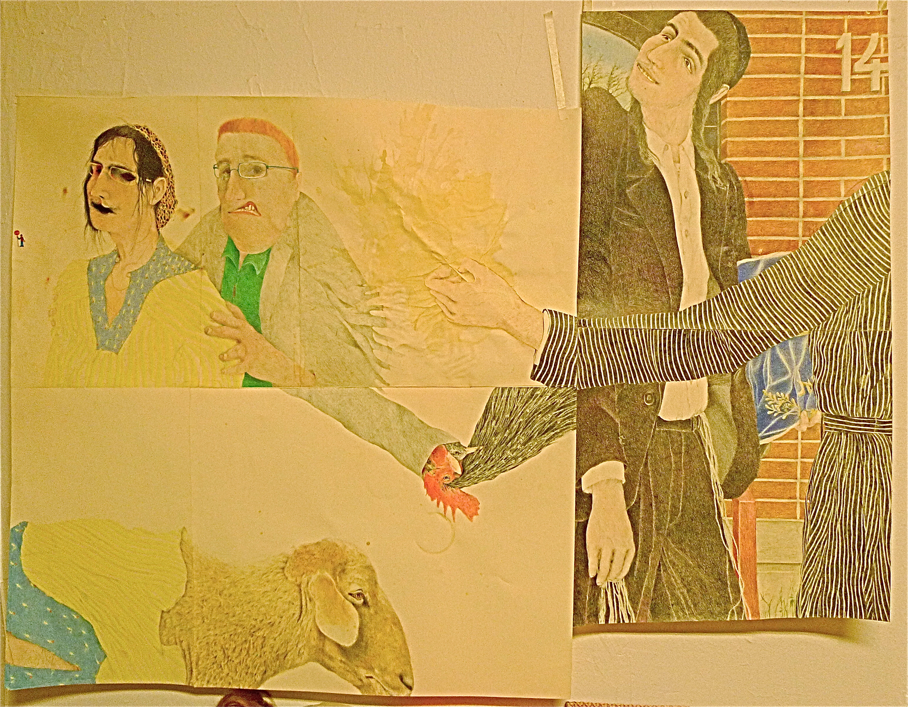 "The images herein depict mundane and fantastic situations enacted by human and animal souls, figures ill and ecstatic about the situations they have been granted. Some figures cannot help but stare or grab at each other, while others step on their companions, soiling any hope of communion. Their wills, like twisted wicks, burn distinct but unified fires. They are composed of several species but they cannot tell themselves apart, awakening loathsome blood in the veins of each body. With sycophantic excitement they conduct every modern day sacrament—murder, construction, commerce, and hygiene (among others). Yet their tangled wills act not in the name of altruism or holiness, but from their everlasting yearning for life’s sweet spots and the age-old wish to dissociate from (or marry) all carnal cravings. These acts set the figures at odds with their surroundings, as flowers ill through winter’s scour."