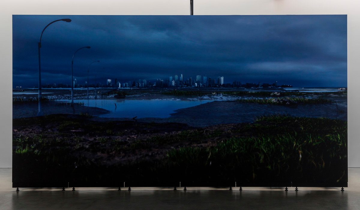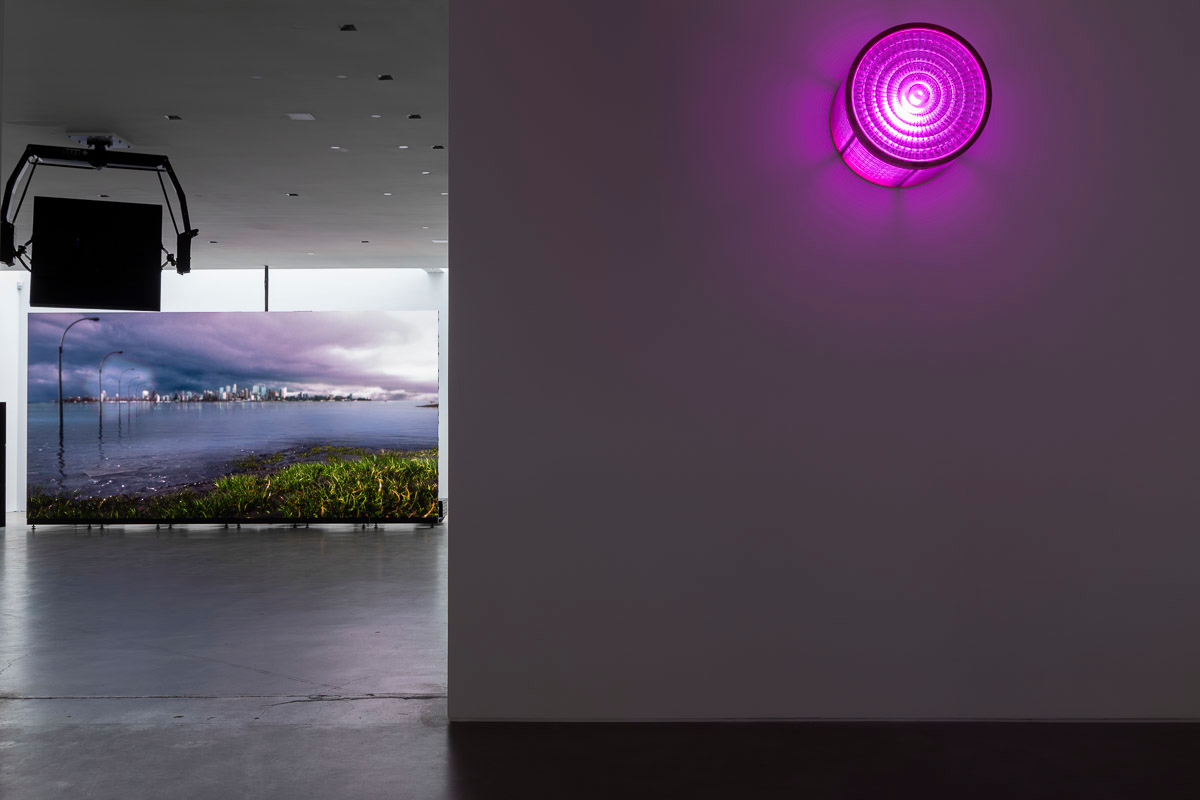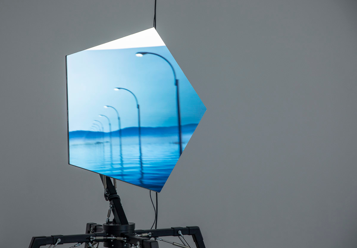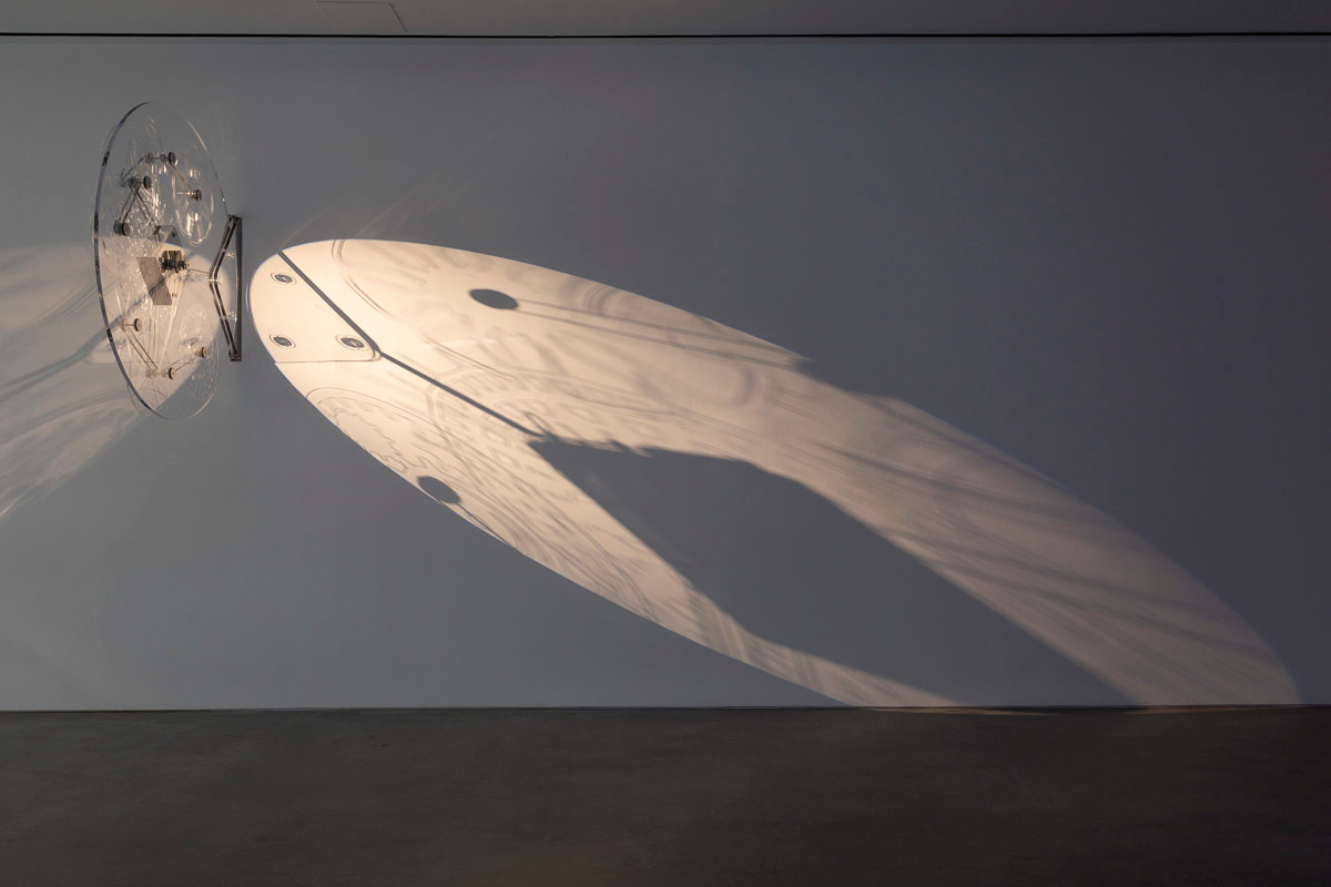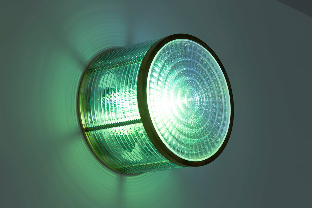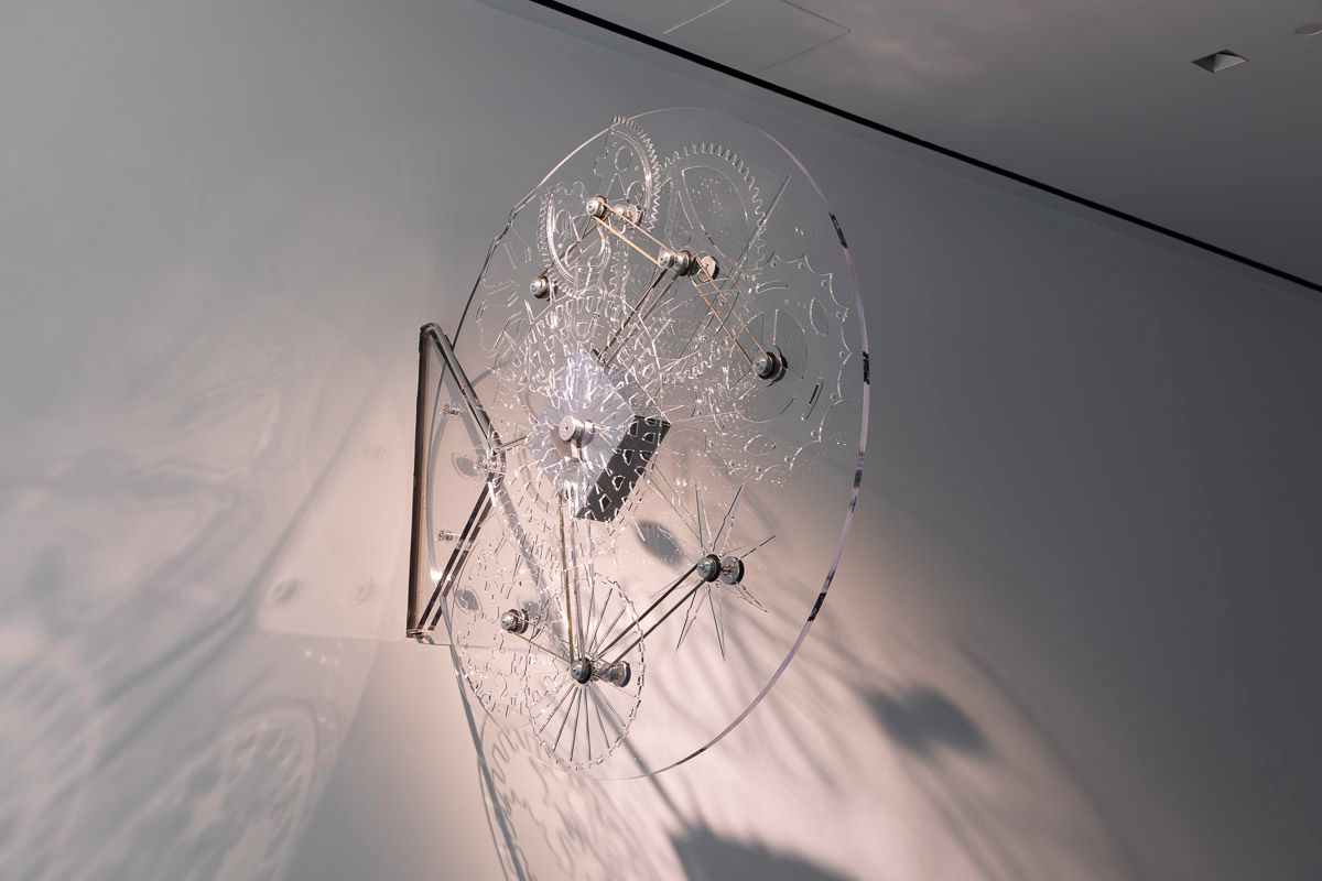 Philippe Parreno’s exhibitions are living organisms, responsive to their environments and the people within them. Think Robert Rauschenberg’s White Paintings (1951), famously described by John Cage as “airports for lights, shadows, and particles” as multi-dimensional entities powered by an AI. Parreno’s exhibition at Gladstone, Hertzian Tales is the most recent manifestation of his ongoing contemplation of art as both sentient and sensual. New and recent works perform an intricate choreography in reaction to multiple stimuli, some as ineffable as the slow melt of time or invisible shifts in barometric pressure, others as shocking and urgent as climate change. The transparent acrylic Clock (2020) with its multiple faces animated by gears controlled by a DMX box, adheres to the forward propulsion of passing minutes, yet stutters and shifts according to changes in the atmosphere. The video, The Owl in Daylight (2020-2023)—never before exhibited in the U.S.—comprises a CGI-animated waterscape in which light and vapor and a fugitive city appear and disappear algorithmically in concert with actual climactic fluctuations. Part weather station, part imaginary world, this digital work pays homage to the last, unfinished, eponymously titled novel by sci-fi author Philip K. Dick, situated on an alien planet that lacks sound and considers the cacophony of Earth as a kind of heaven. The video’s generative soundtrack was conceived by composer and sound engineer Nicolas Becker to blend naturalistic noises with abstract echoes of our tech-driven landscape. An additional layer of sound interacts with the video for its current manifestation in the gallery. The voice of actor Charlotte Gainsbourg (with whom Parreno is currently working on a film project) responds to the natural forces depicted on the screen, becoming one with the water, the wind, and the rain. The non-narrative voiceover is determined by a computer program that syncs sound with the mutable components of the video. Using the Markov model, which assumes that all future states depend only on the current state, the algorithm allows endless permutations. Parreno’s heliostat sculpture, which typically captures the movement of sunlight to then reflect it onto a stationary point, here follows the sound of Gainsbourg’s voice, sending a ray of solar energy onto the screen in response to it. Like the beam of a film projector in a cinema, this light alludes to an unfolding narrative. The heliostat, the voiceover, and the video are synchronized like a mechanical ballet, a multi-part automaton recounting a lyrical, esoteric story.