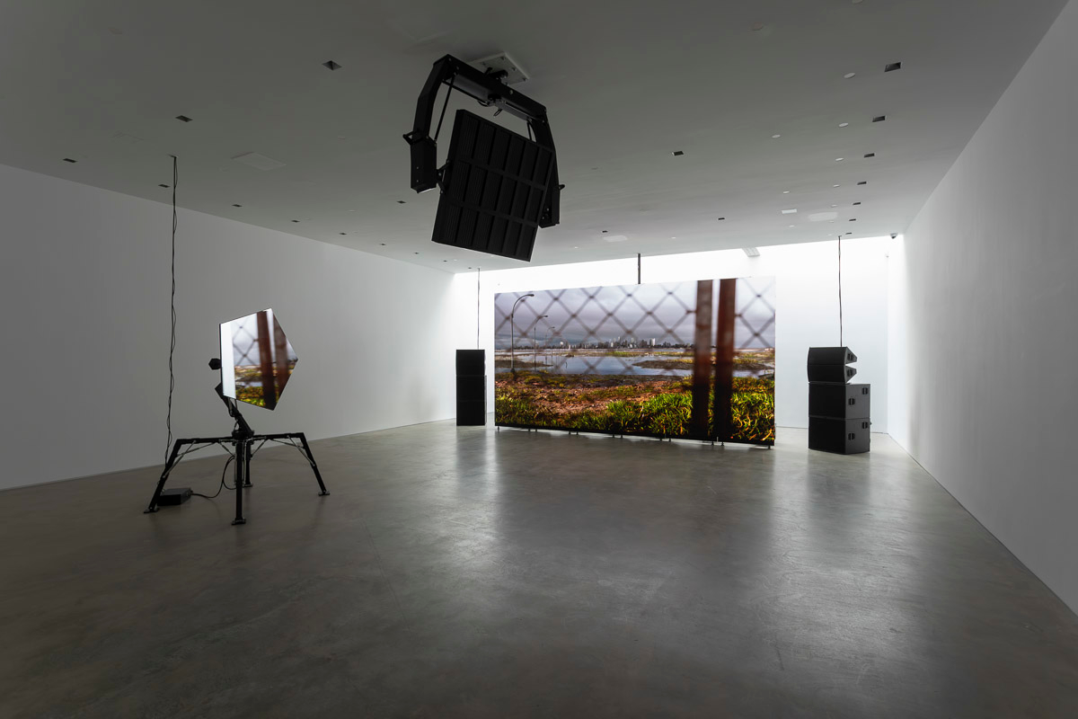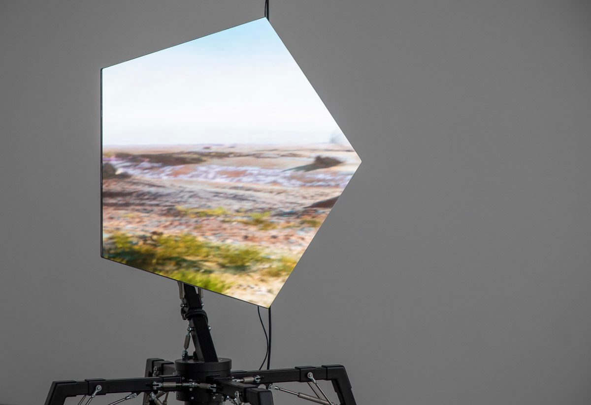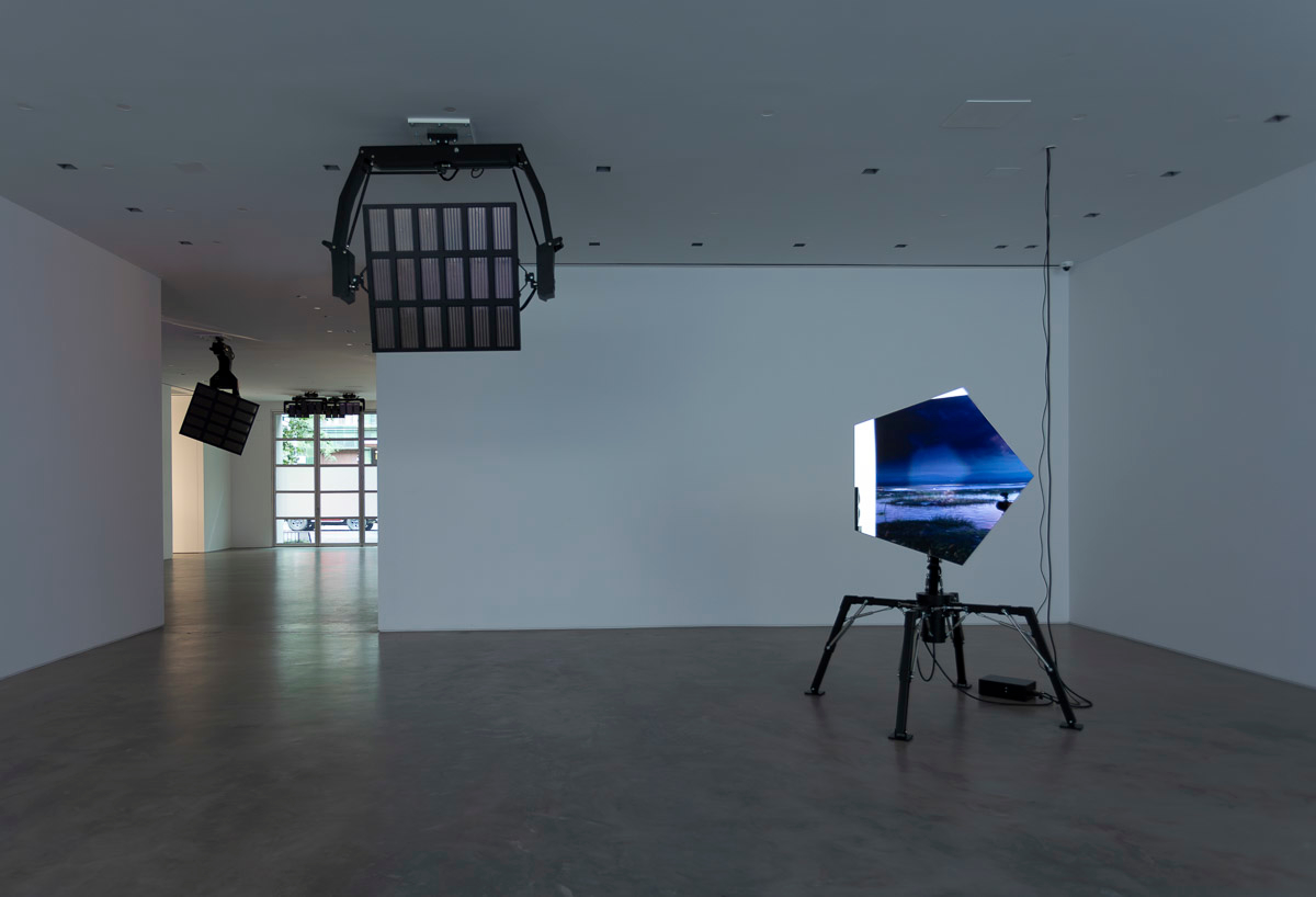 Hertzian Tales—an allusion to the flow of electromagnetic waves—operates as a self-regulating system, adhering to a predetermined sequence of operations. Yet, within its framework, the intricate interplay of elements births feedback loops, unexpected variables, and non-linear events—making outcomes elusive and unpredictable. At its core, the exhibition can be distilled into a formula of interdependencies: climactic fluctuations animate a film, which in turn modulates the soundtrack. This auditory landscape then influences a voice, ultimately guiding the movement of a heliostat.