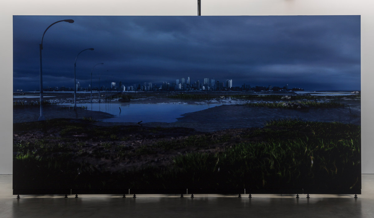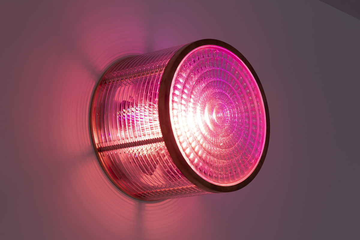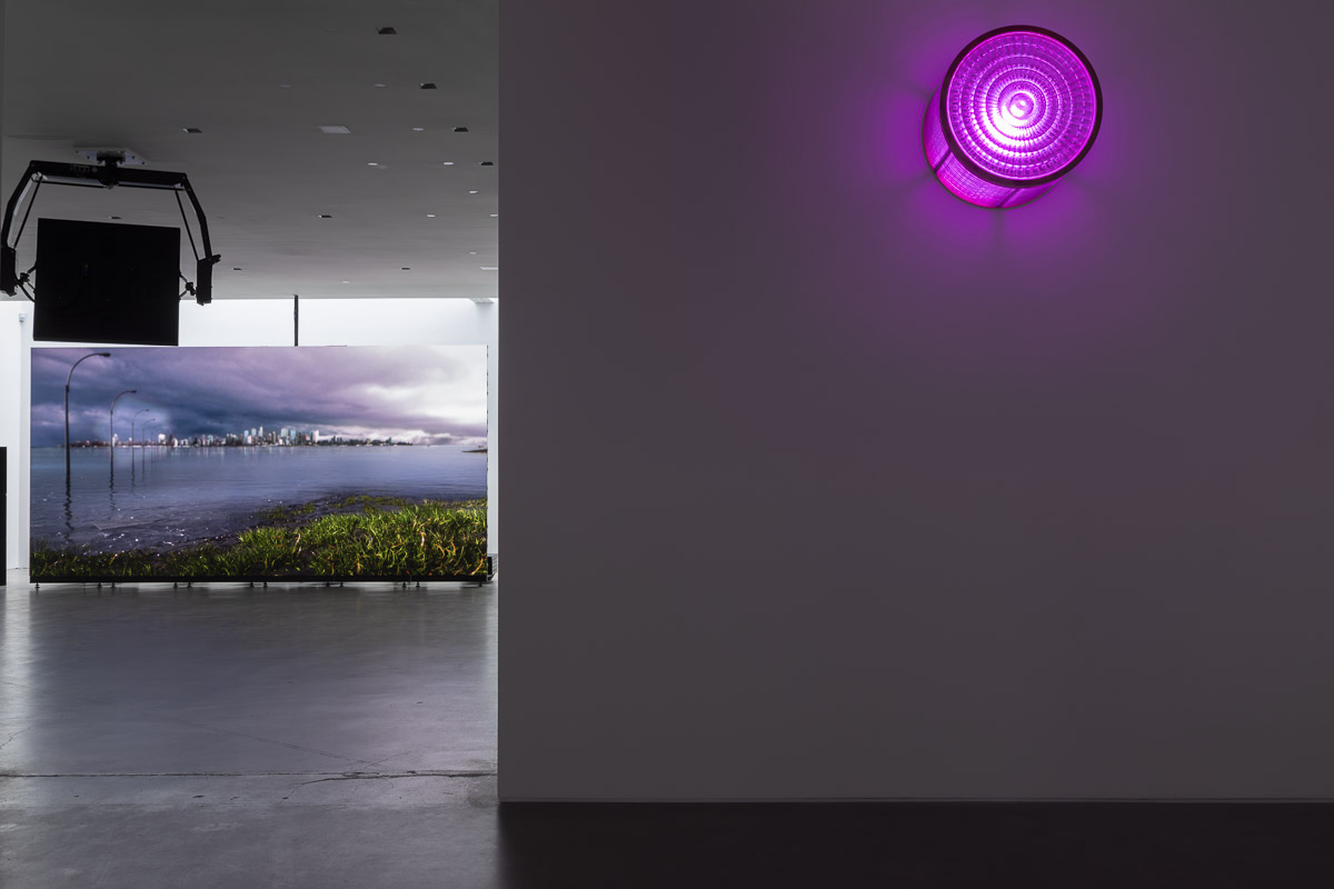Philippe Parreno’s exhibitions are living organisms, responsive to their environments and the people within them. Think Robert Rauschenberg’s White Paintings (1951), famously described by John Cage as “airports for lights, shadows, and particles” as multi-dimensional entities powered by an AI. Parreno’s exhibition at Gladstone, Hertzian Tales is the most recent manifestation of his ongoing contemplation of art as both sentient and sensual. New and recent works perform an intricate choreography in reaction to multiple stimuli, some as ineffable as the slow melt of time or invisible shifts in barometric pressure, others as shocking and urgent as climate change. The transparent acrylic Clock (2020) with its multiple faces animated by gears controlled by a DMX box, adheres to the forward propulsion of passing minutes, yet stutters and shifts according to changes in the atmosphere. The video, The Owl in Daylight (2020-2023)—never before exhibited in the U.S.—comprises a CGI-animated waterscape in which light and vapor and a fugitive city appear and disappear algorithmically in concert with actual climactic fluctuations. Part weather station, part imaginary world, this digital work pays homage to the last, unfinished, eponymously titled novel by sci-fi author Philip K. Dick, situated on an alien planet that lacks sound and considers the cacophony of Earth as a kind of heaven. The video’s generative soundtrack was conceived by composer and sound engineer Nicolas Becker to blend naturalistic noises with abstract echoes of our tech-driven landscape. An additional layer of sound interacts with the video for its current manifestation in the gallery. The voice of actor Charlotte Gainsbourg (with whom Parreno is currently working on a film project) responds to the natural forces depicted on the screen, becoming one with the water, the wind, and the rain. The non-narrative voiceover is determined by a computer program that syncs sound with the mutable components of the video. Using the Markov model, which assumes that all future states depend only on the current state, the algorithm allows endless permutations. Parreno’s heliostat sculpture, which typically captures the movement of sunlight to then reflect it onto a stationary point, here follows the sound of Gainsbourg’s voice, sending a ray of solar energy onto the screen in response to it. Like the beam of a film projector in a cinema, this light alludes to an unfolding narrative. The heliostat, the voiceover, and the video are synchronized like a mechanical ballet, a multi-part automaton recounting a lyrical, esoteric story.