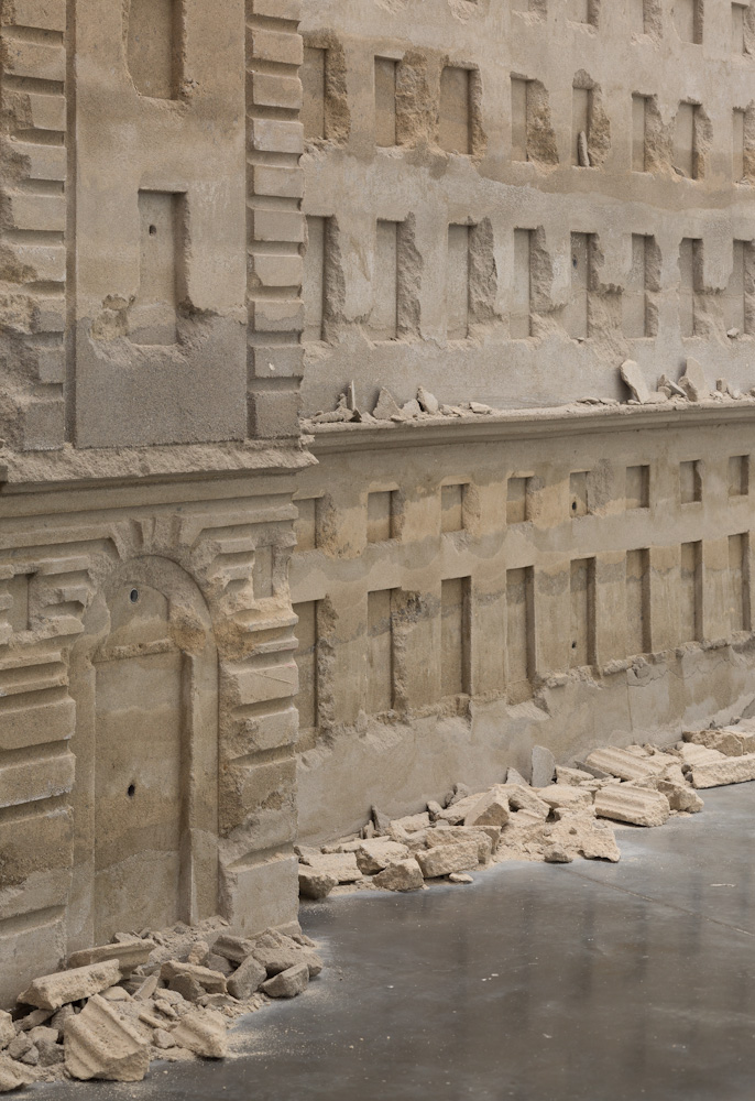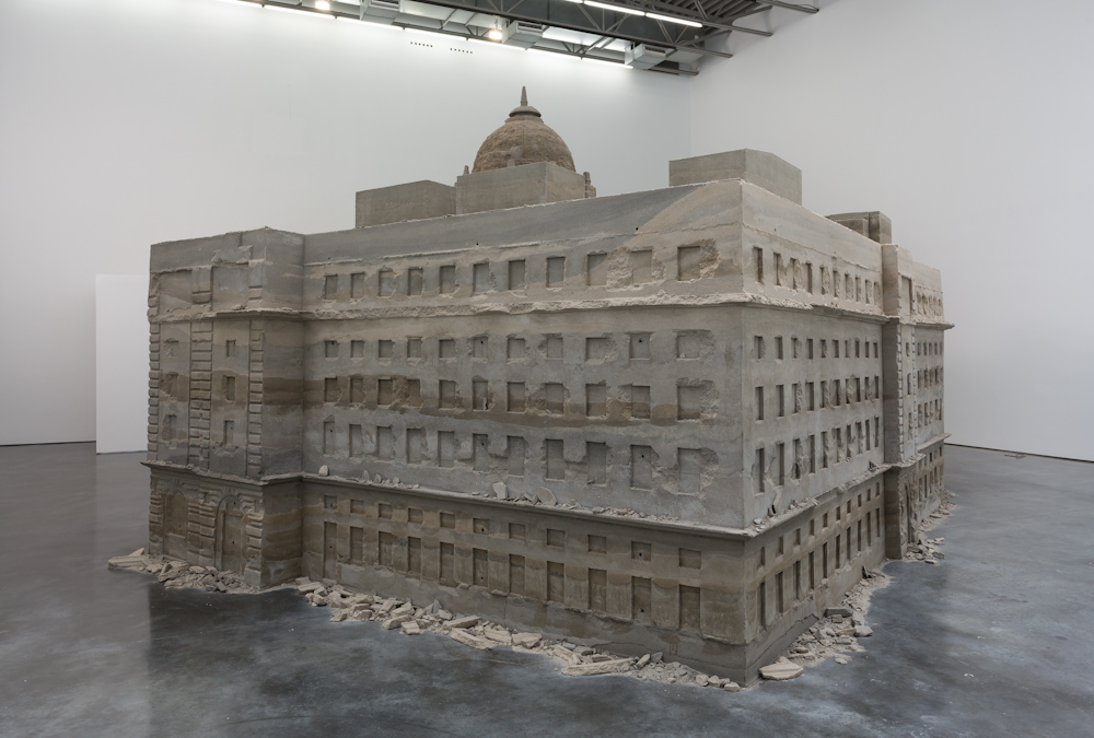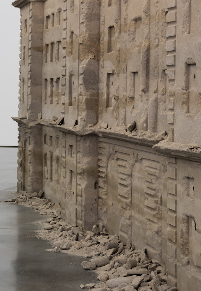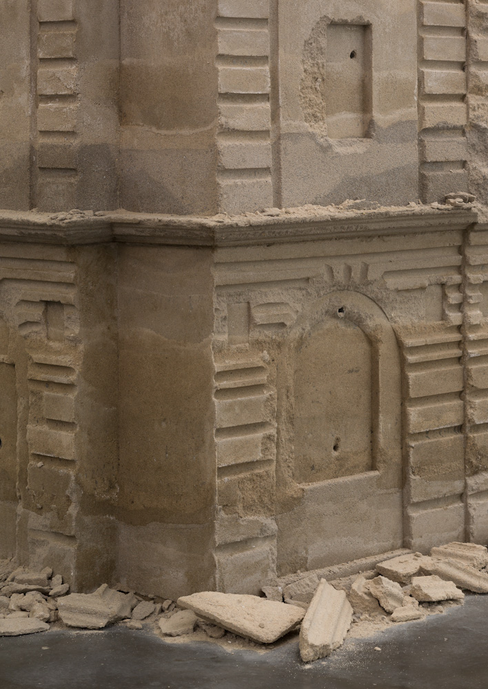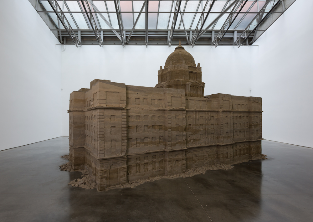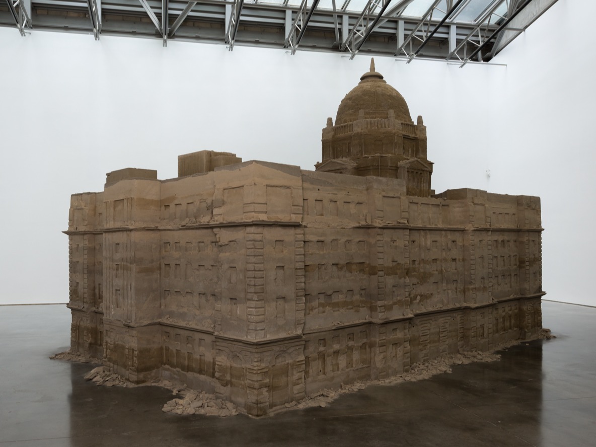 Bank of Sand, Sand of Bank derives its structure from the former HSBC Bank in Shanghai, built in 1923 by the British architecture firm Palmer & Turner. During the Chinese Revolution of 1949, this Neoclassical landmark was transformed into the Communist Municipal People’s Government Building, and later became the headquarters for the Pudong Development Bank in the 1990s. Huang’s 20-ton replica of this edifice, comprised of sand and concrete, contemplates the troubling history this building has lived through while questioning the power of ruling institutions. Through the use of unstable materials, this building, which is meant to stand for security and power, is transformed into a vulnerable and forgotten ruin that appears as though it could collapse at a moment’s notice. The work’s fragility and temporality visualizes the turbulent past and exchanges of power this monument has witnessed over time, while also providing a deeper narrative surrounding the longevity and effectiveness of governing bodies throughout history.