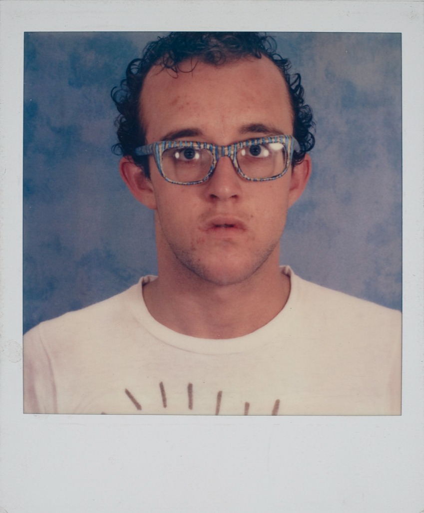 Keith Haring Self-portrait wearing glasses painted by Kenny Scharf, Polaroid, circa 1980.