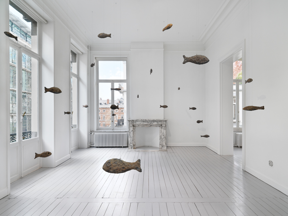 Gladstone is pleased to present primordial, an exhibition of new works by Ugo Rondinone. Within the Brussels gallery space, Rondinone creates another universe with forty-seven sculptures: each form is named after a natural phenomenon and embodied by a bronze fish suspended on wire. These sculptures follow in a series that includes bronze-cast birds (primitive, 2011) and horses (primal, 2013). Rondinone’s three groupings of animals stand in for the world beyond the exhibition space, representing the transience and temporality of the natural world. This menagerie of forms belonging to air, land, and water represents timeless occurrences within the cosmos while demonstrating infinite reincarnations.