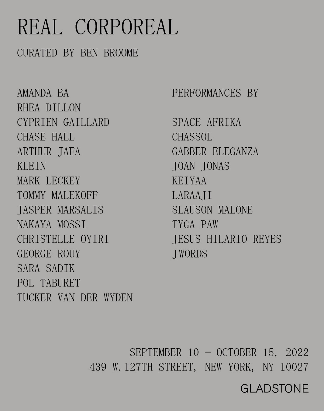 Gladstone Gallery is pleased to announce Real Corporeal, a group exhibition of works by Amanda Ba, Rhea Dillon, Cyprien Gaillard, Chase Hall, Arthur Jafa, Klein, Mark Leckey, Tommy Malekoff, Jasper Marsalis, nakaya mossi, Christelle Oyiri, George Rouy, Sara Sadik, Pol Taburet and Tucker van der Wyden.