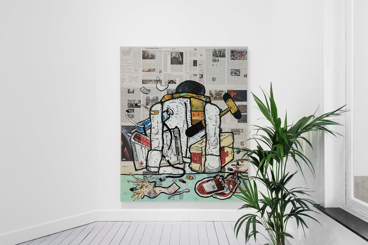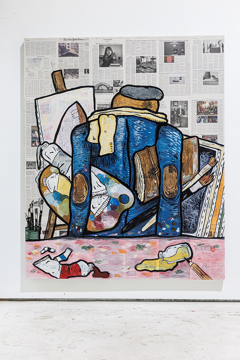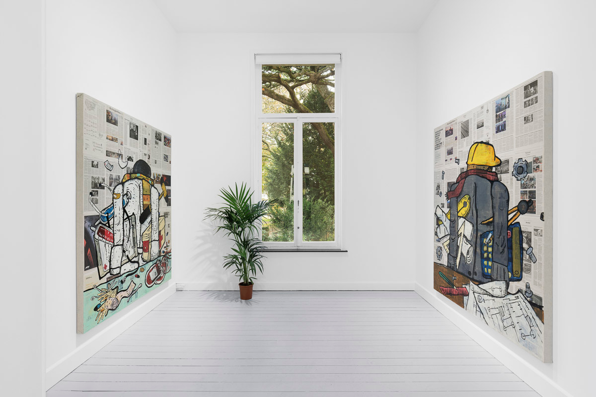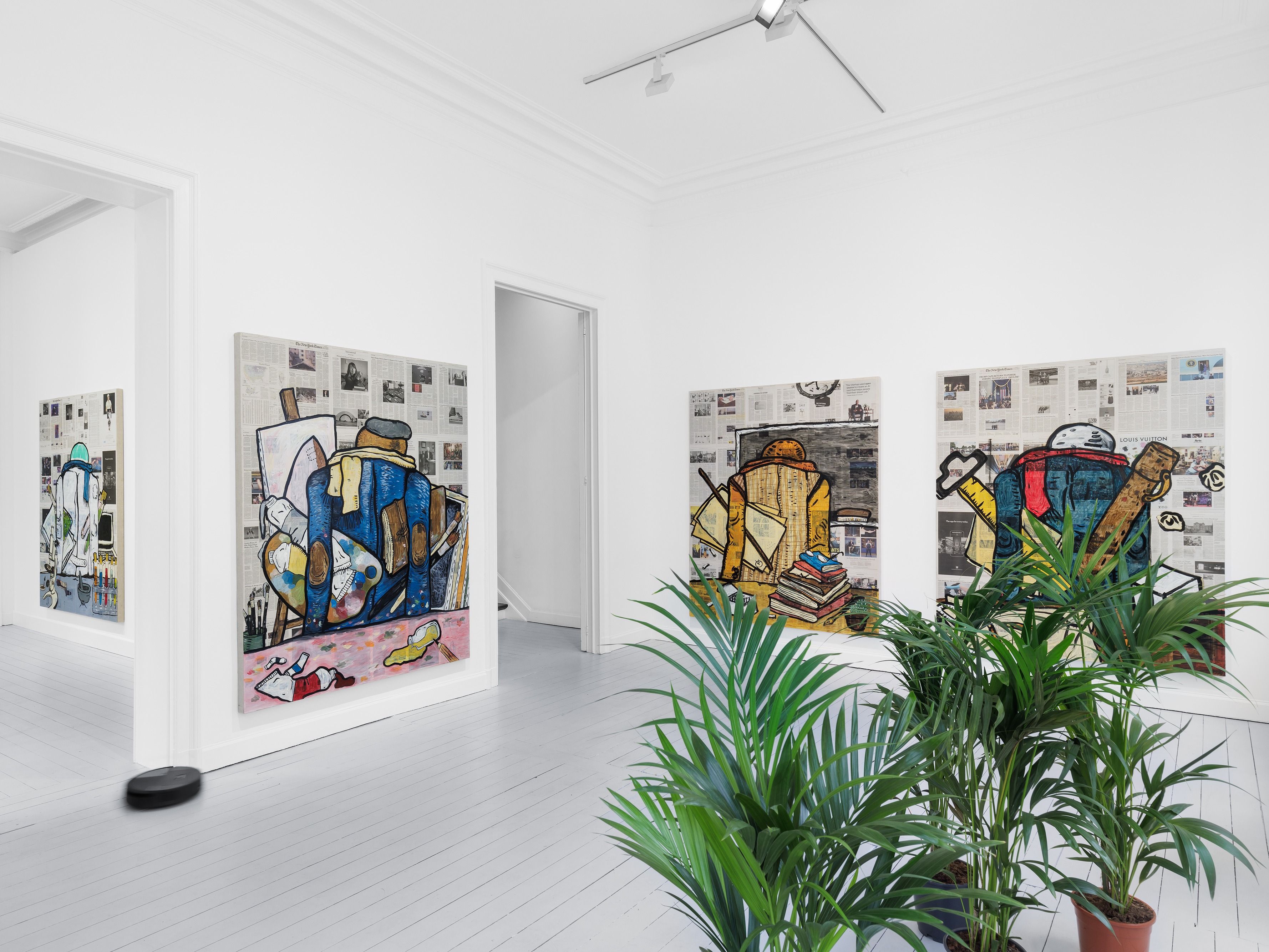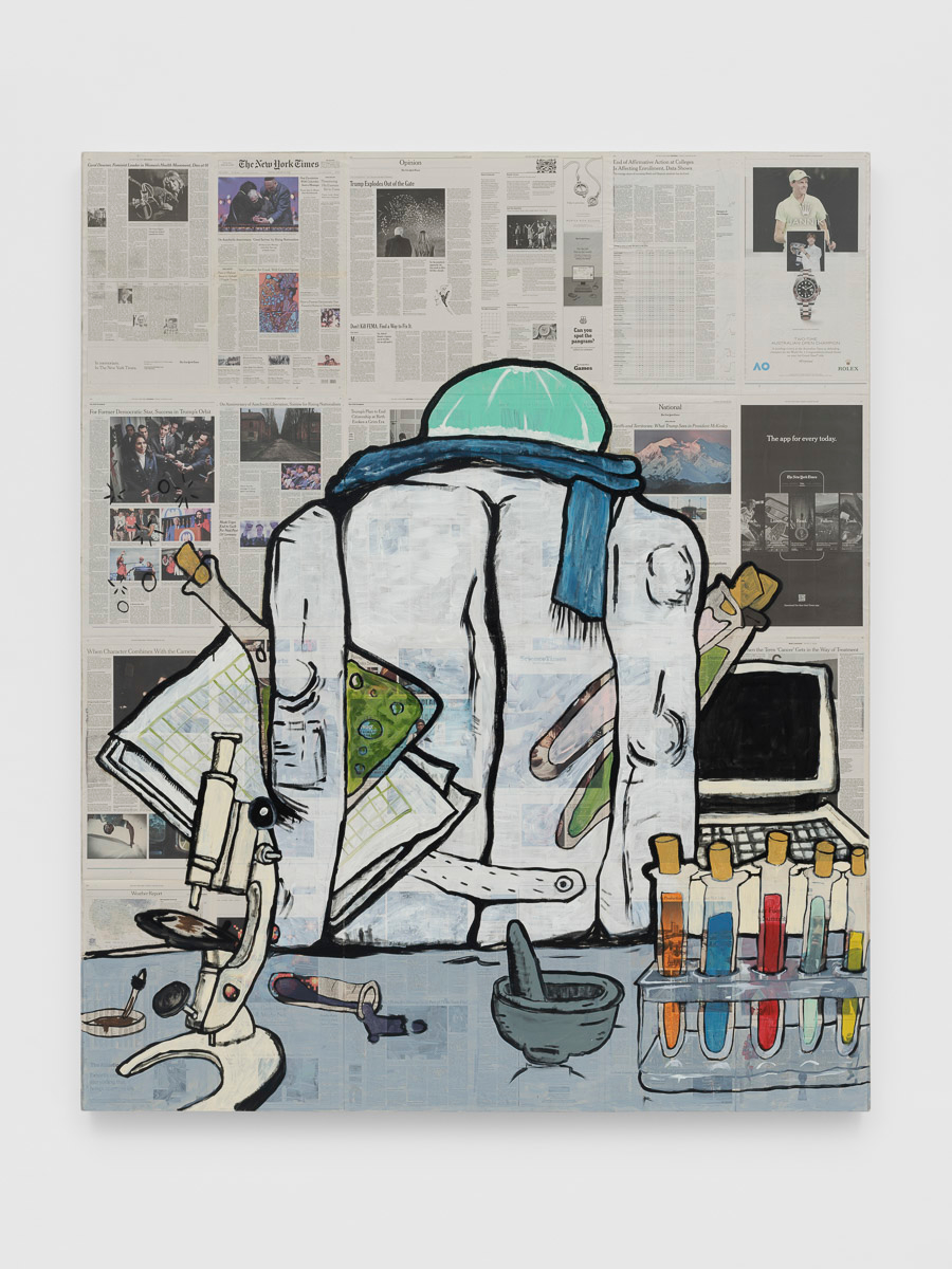 For his third solo exhibition at Gladstone Gallery, (the intellects take leave), Rirkrit Tiravanija presents seven new paintings on newspapers that reflect on global crises and American political upheaval. Inspired by the practice of the late Canadian-American artist Philip Guston, the new works build upon Tiravanija’s ongoing, multidisciplinary exploration of civil unrest and social issues.