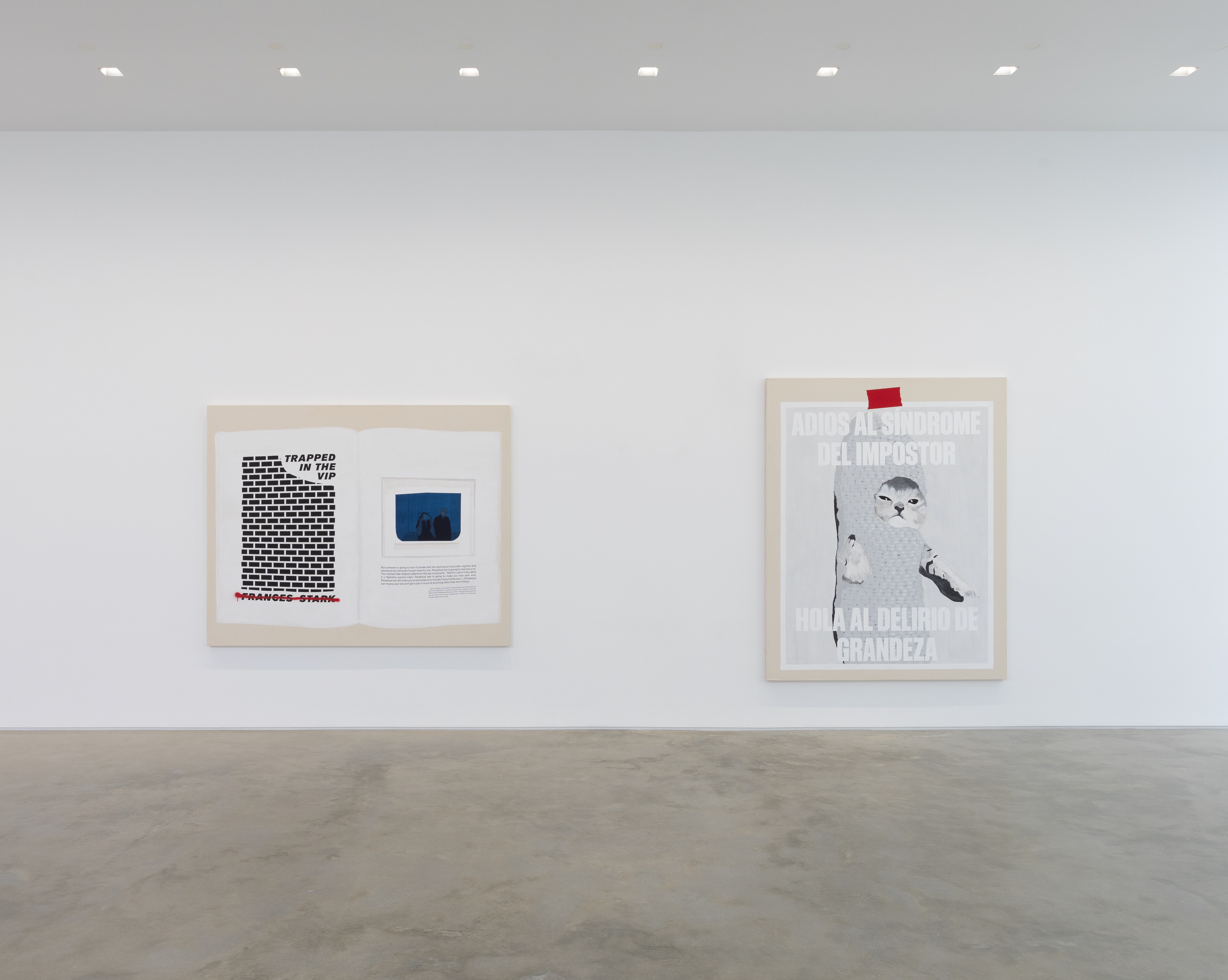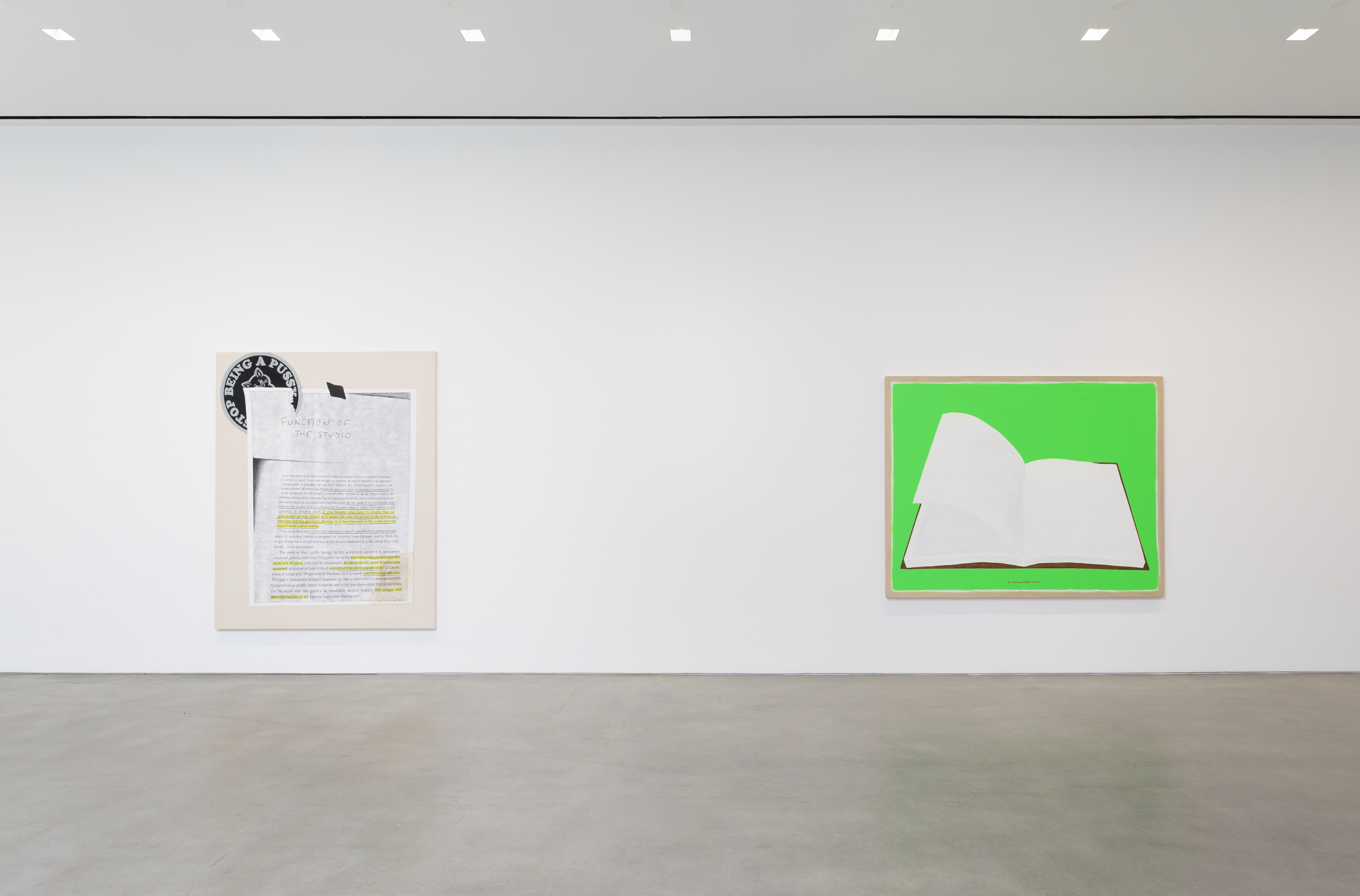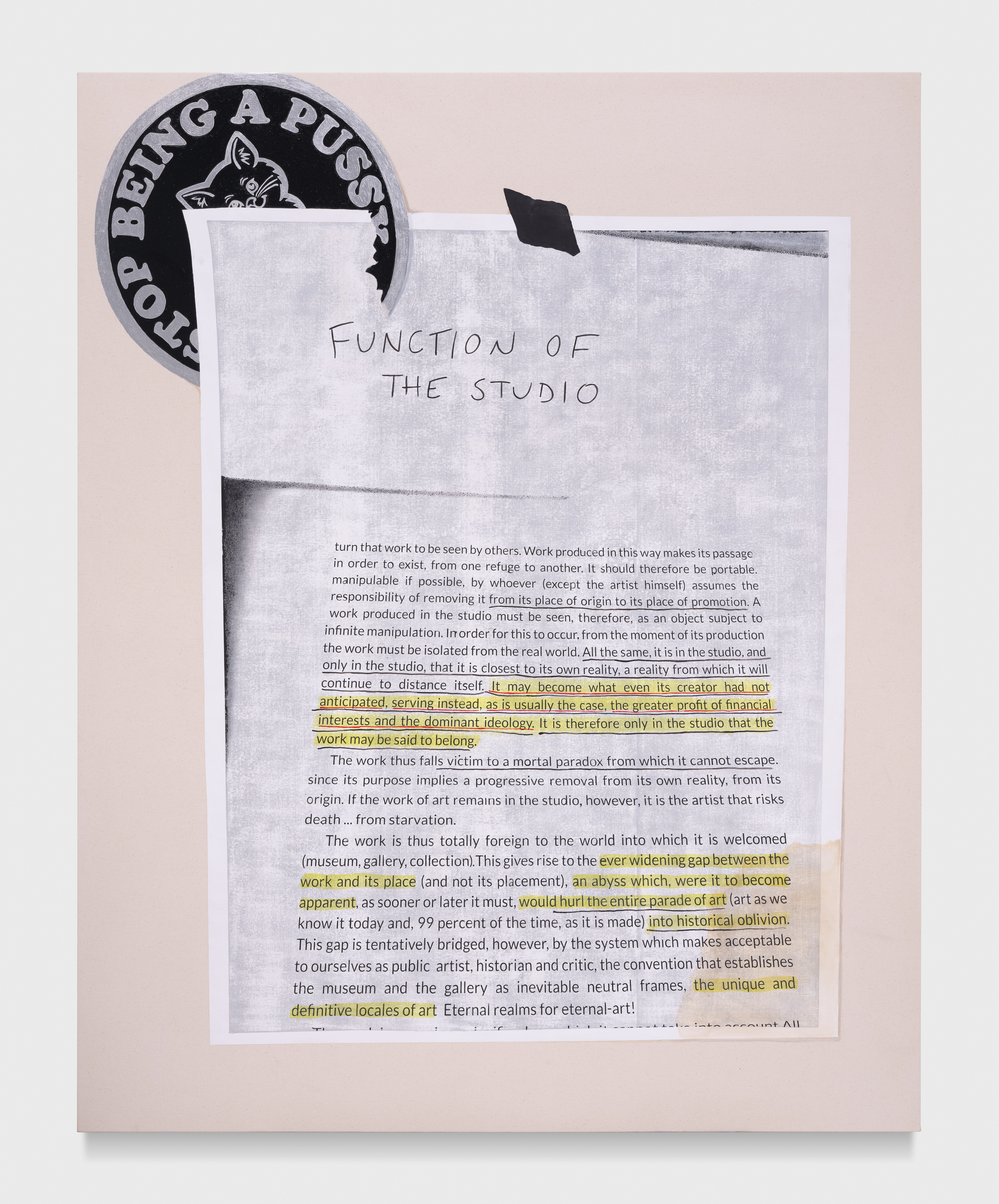 Gladstone is pleased to present Serve the Dominant Ideology or Stop Being a Pussy, the gallery’s first exhibition with artist and writer, Frances Stark. A key figure in the Los Angeles art community for more than three decades, Stark’s interdisciplinary practice incorporates painting, video, collage, performance, drawing, and text to explore how, like literature, personal interactions can become surrogate spaces for broader cultural experiences. At the center of Stark’s often-confessional practice are a series of propositions regarding reflection, repetition, and emotional reconstitution; merging the visual with the textual and fantasy with biography, the artist highlights the neglected sites of overlap that connect art with life.