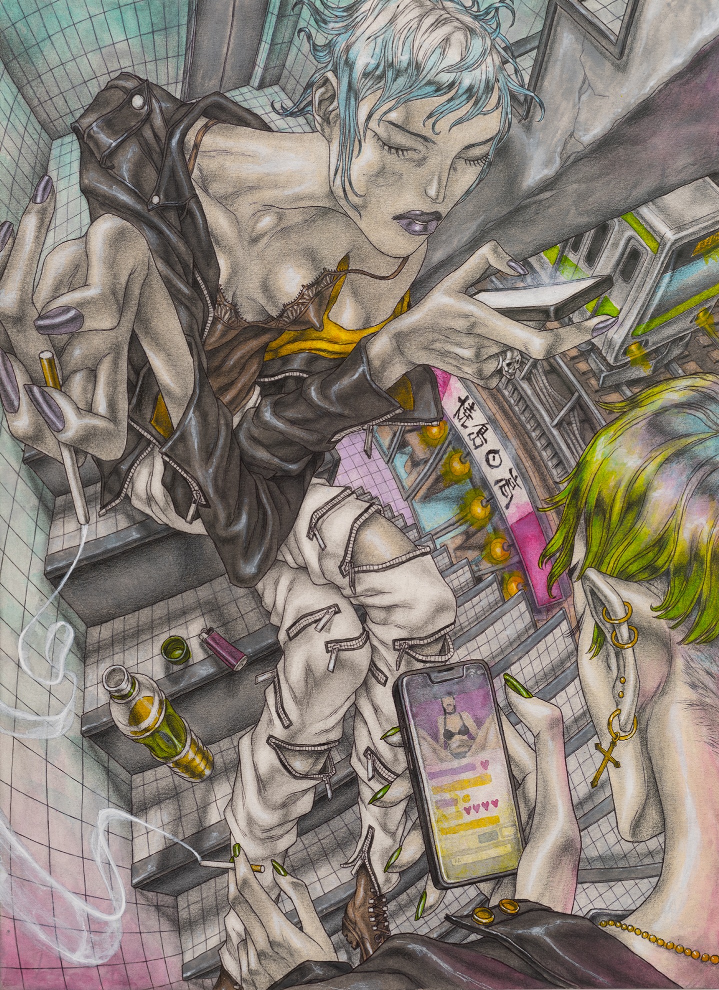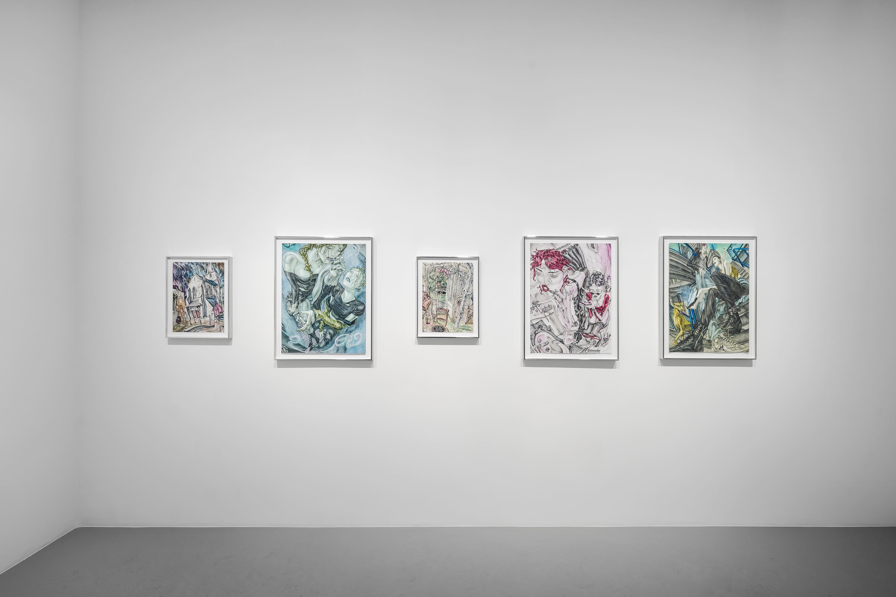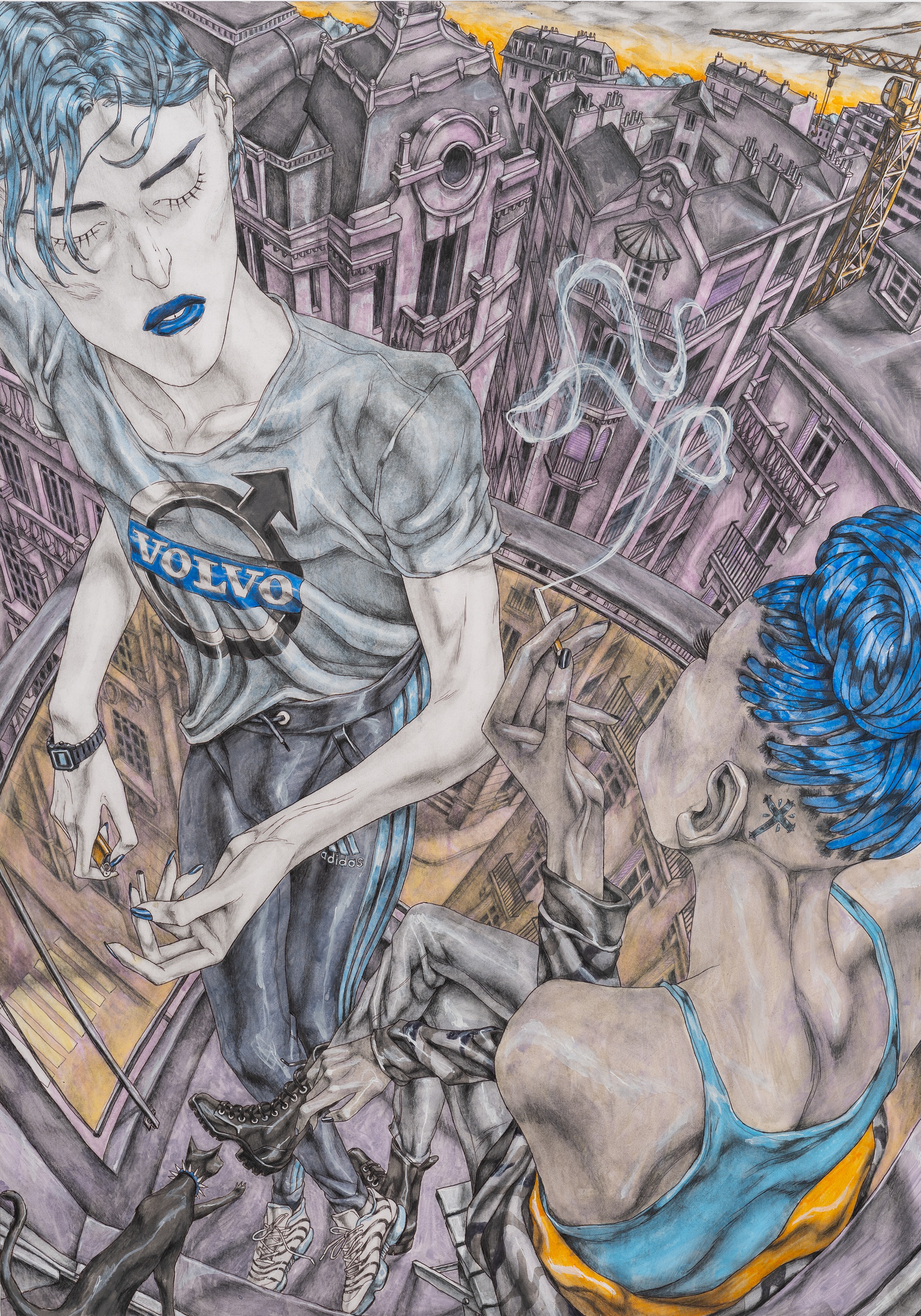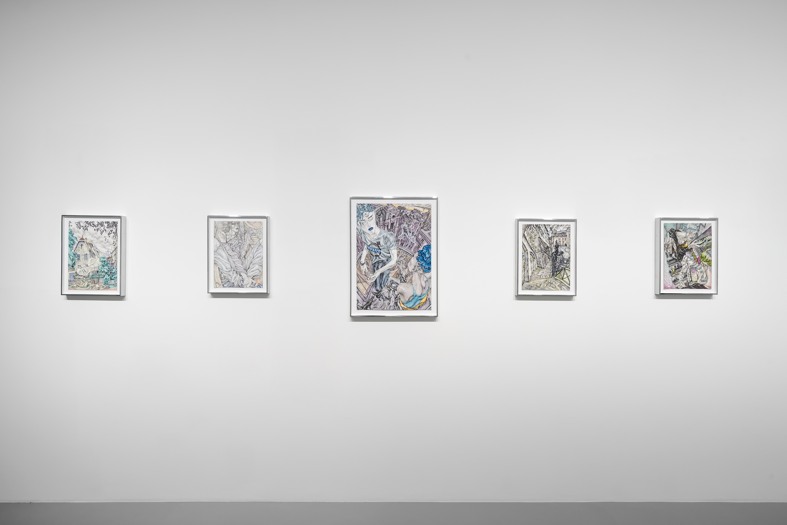 David Rappeneau is a French artist. Those are the only facts he will confirm: his name, citizenry, and occupation. In a time of ever-expanding transparency and dissolving privacy standards, his refusal to participate in interviews, appear at his openings, or participate in person with the art world stands apart from accepted practices of self-promotion. Often referred to as an enigma himself, Rappeneau’s work mirrors this aura of laconic mystique, creating a stark contrast between heavily and carefully worked drawings and an artist impossible to see. His drawings, devoid of explicit language, employ ballpoint pens, fluorescent markers, and acrylic paint to craft distorted yet deeply saturated depictions of enigmatic individuals and cryptic landscapes. His subjects can be grungy youth, absorbed in mundane yet mesmerizing activities, video games, fleeting encounters, conspicuous consumption, or any other quickly achievable means of escape. Rappeneau’s depictions recall surrealism with a documentarian lens, revealing youth culture with the stylized allure reminiscent of graphic novels and anime, with art historical references as far reaching as Mannerism, Albrecht Dürer, and Egon Schiele. Experimenting with perspective and figuration, Rappeneau captures the complexities of youth within an eerie and seductive world. Rappeneau’s provocative artworks offer a glimpse into a dystopian realm where mutated bodies, narcotics, and melancholic longing converge within the embodied celestial creations. David Rappeneau has exhibited with Gladstone Gallery, Brussels; Queer Thoughts; FRAC Corsica; Super Dakota; Galerie Derouillon; Peres Projects; Edward Ressle; Centre d’Art Contemporain La Synagogue de Delme; Galerie Crevecoeur.