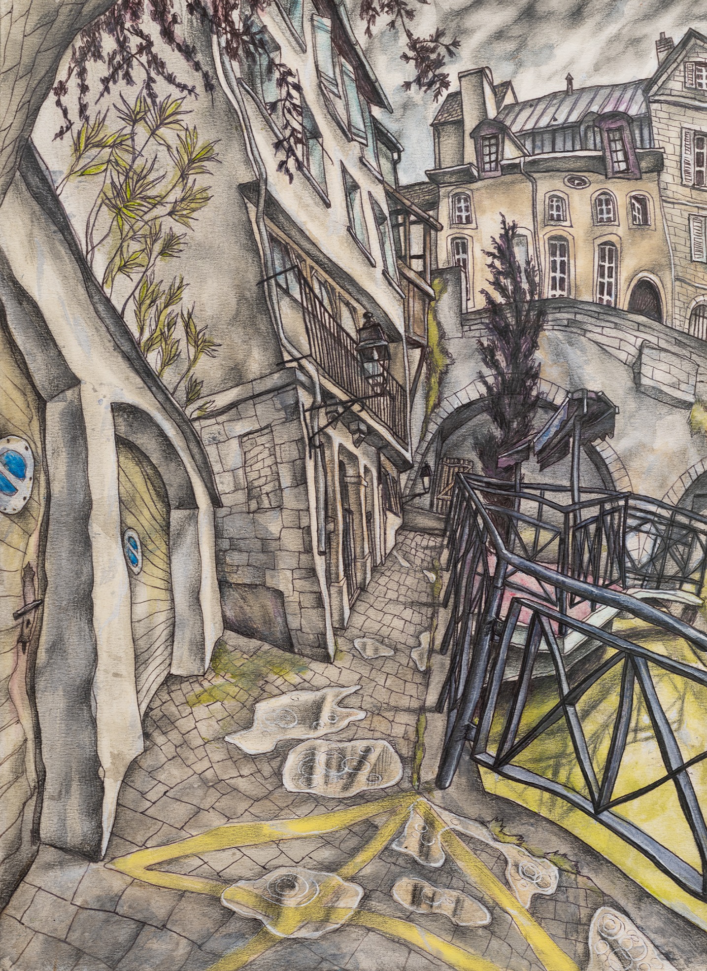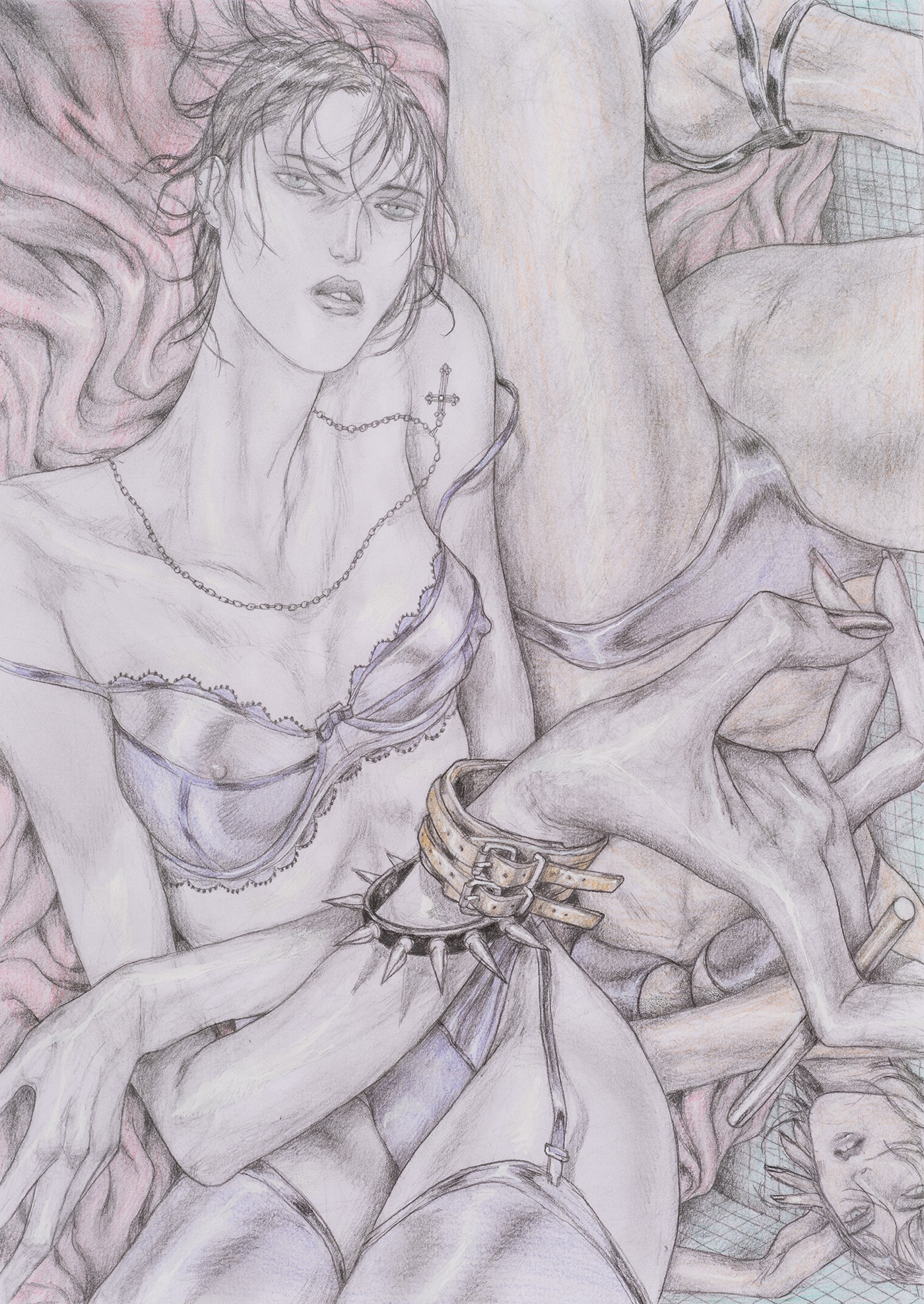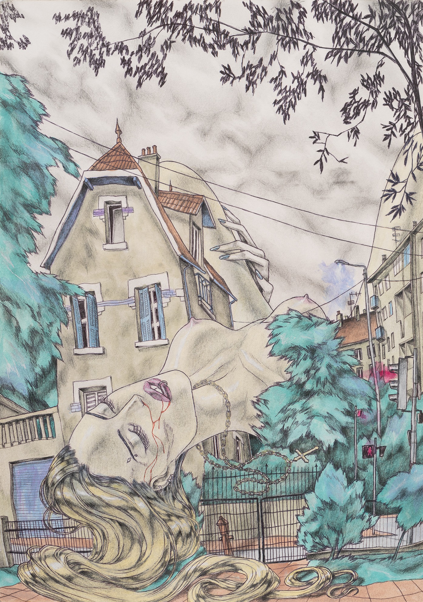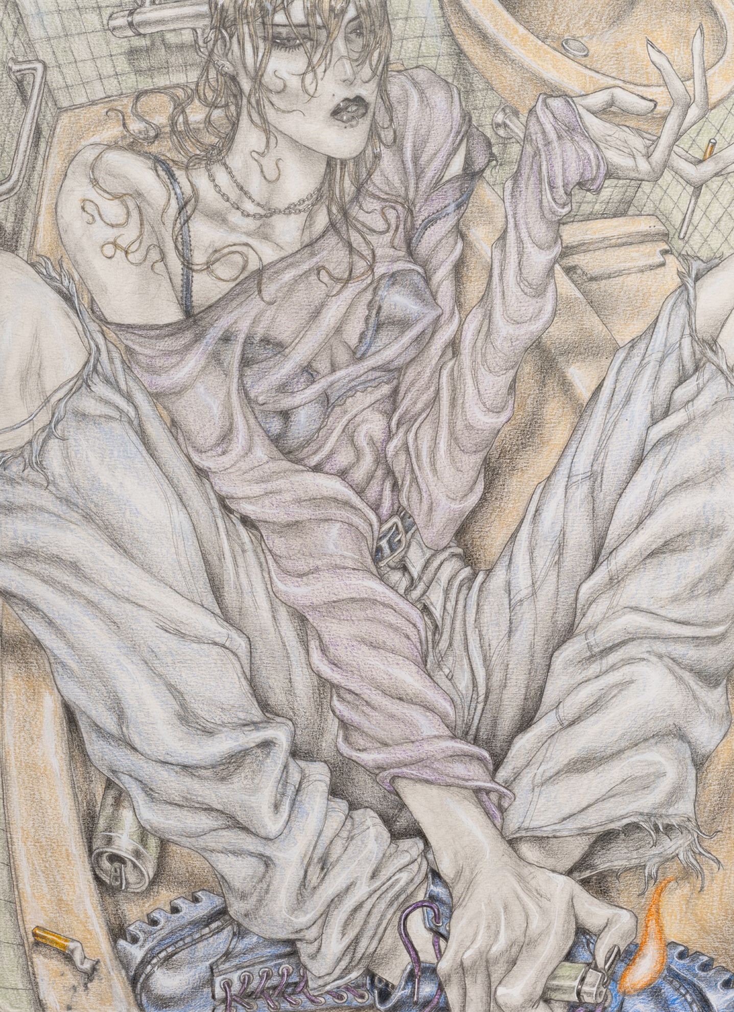David Rappeneau is a French artist. Those are the only facts he will confirm: his name, citizenry, and occupation. In a time of ever-expanding transparency and dissolving privacy standards, his refusal to participate in interviews, appear at his openings, or participate in person with the art world stands apart from accepted practices of self-promotion. Often referred to as an enigma himself, Rappeneau’s work mirrors this aura of laconic mystique, creating a stark contrast between heavily and carefully worked drawings and an artist impossible to see. His drawings, devoid of explicit language, employ ballpoint pens, fluorescent markers, and acrylic paint to craft distorted yet deeply saturated depictions of enigmatic individuals and cryptic landscapes. His subjects can be grungy youth, absorbed in mundane yet mesmerizing activities, video games, fleeting encounters, conspicuous consumption, or any other quickly achievable means of escape. Rappeneau’s depictions recall surrealism with a documentarian lens, revealing youth culture with the stylized allure reminiscent of graphic novels and anime, with art historical references as far reaching as Mannerism, Albrecht Dürer, and Egon Schiele. Experimenting with perspective and figuration, Rappeneau captures the complexities of youth within an eerie and seductive world. Rappeneau’s provocative artworks offer a glimpse into a dystopian realm where mutated bodies, narcotics, and melancholic longing converge within the embodied celestial creations. David Rappeneau has exhibited with Gladstone Gallery, Brussels; Queer Thoughts; FRAC Corsica; Super Dakota; Galerie Derouillon; Peres Projects; Edward Ressle; Centre d’Art Contemporain La Synagogue de Delme; Galerie Crevecoeur.