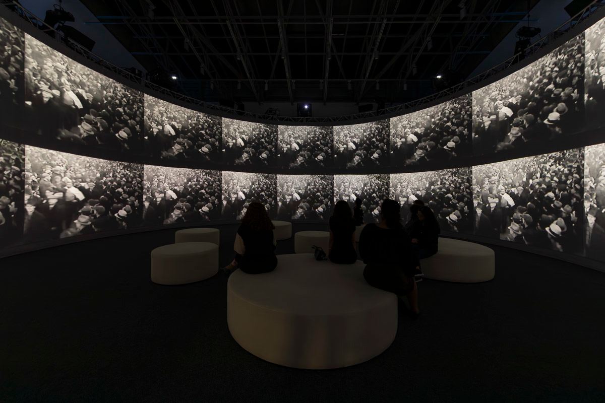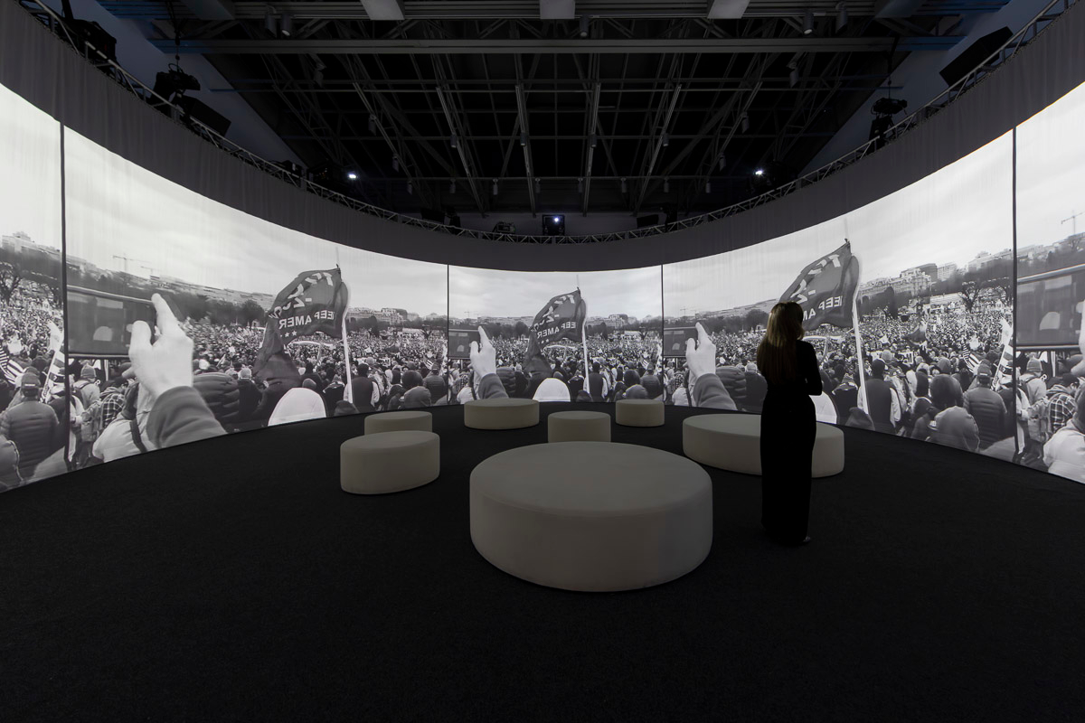 Carrie Mae Weems’ Cyclorama: The Shape of Things (2021) is a culminating work in an ongoing, four-decade-long career dedicated to probing the jagged history of racial injustice in the United States and the world at large. On view almost continuously in different museum venues since its acclaimed premiere at the Park Avenue Armory in New York, The Shape of Things will return to the city in a special, free-to-the public, presentation at Gladstone, which coincides with the 2024 presidential election and to mark the artist’s inaugural exhibition with the gallery. At this moment of grave political precarity, with democracy itself on the ballot, Weems’ video installation immerses the viewer in a moving visual and sonic evocation of resistance, resilience, and redemption. Projected within a cylindrical structure, The Shape of Things draws its panoramic imagery from the 19th-century cyclorama, a popular form of entertainment comprising a 360° history painting often depicting epic battles and military conquests, frequently, and not unironically here, those from the Civil War. These circular murals and the structures that housed them would travel from city to city across the country, like the circus—another potent source for Weems in her quest to convey the convoluted spirit of our times, when tragedy and absurdity conspire together but cannot, despite all apparent efforts, drown out hope.
