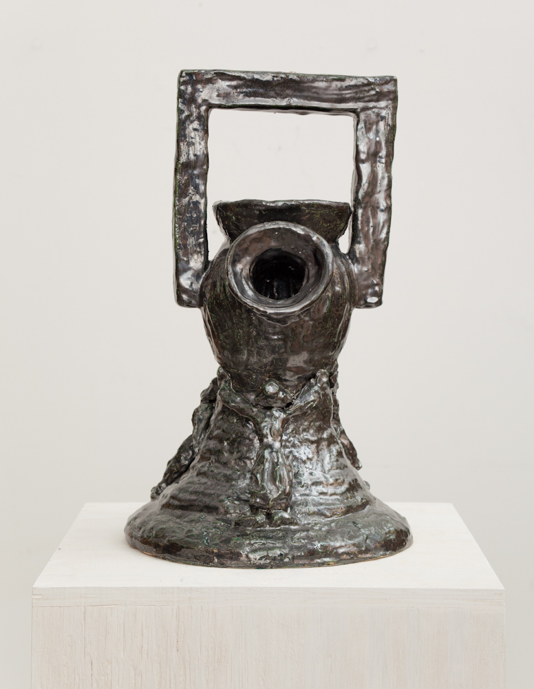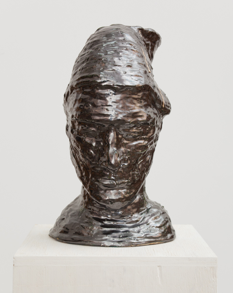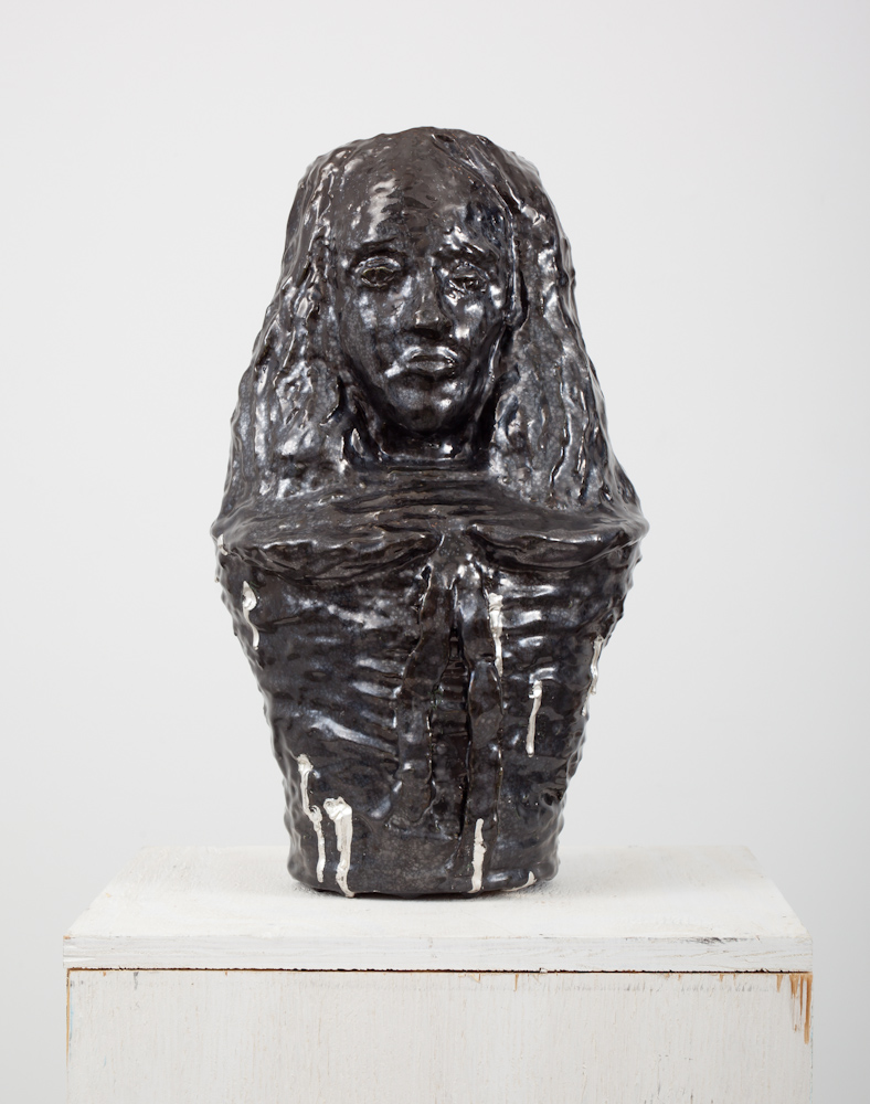 Structure: wood, tape, twine, cheesecloth, wax, paint and shellac. Head sculpture: mud, rope, foam, rubber, shellac and acrylic.