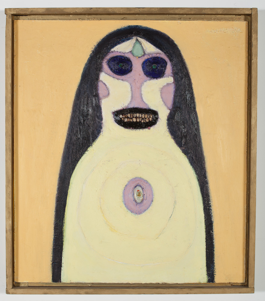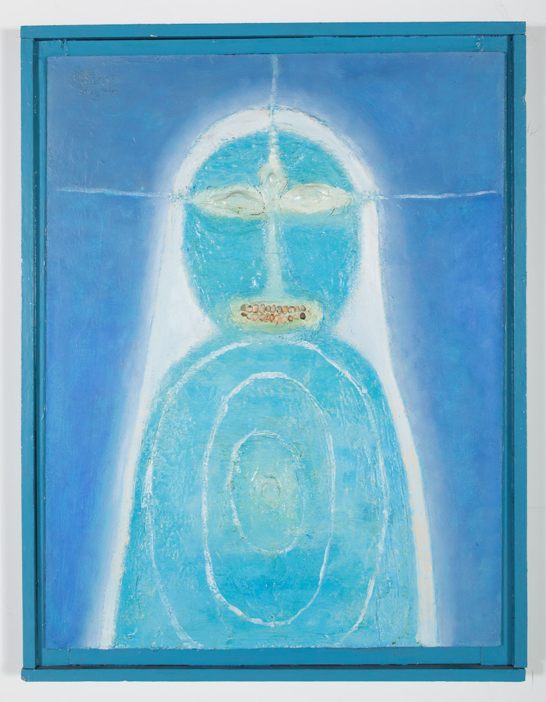 Oil, mortar, colored glass, pebbles and shells on hardboard
