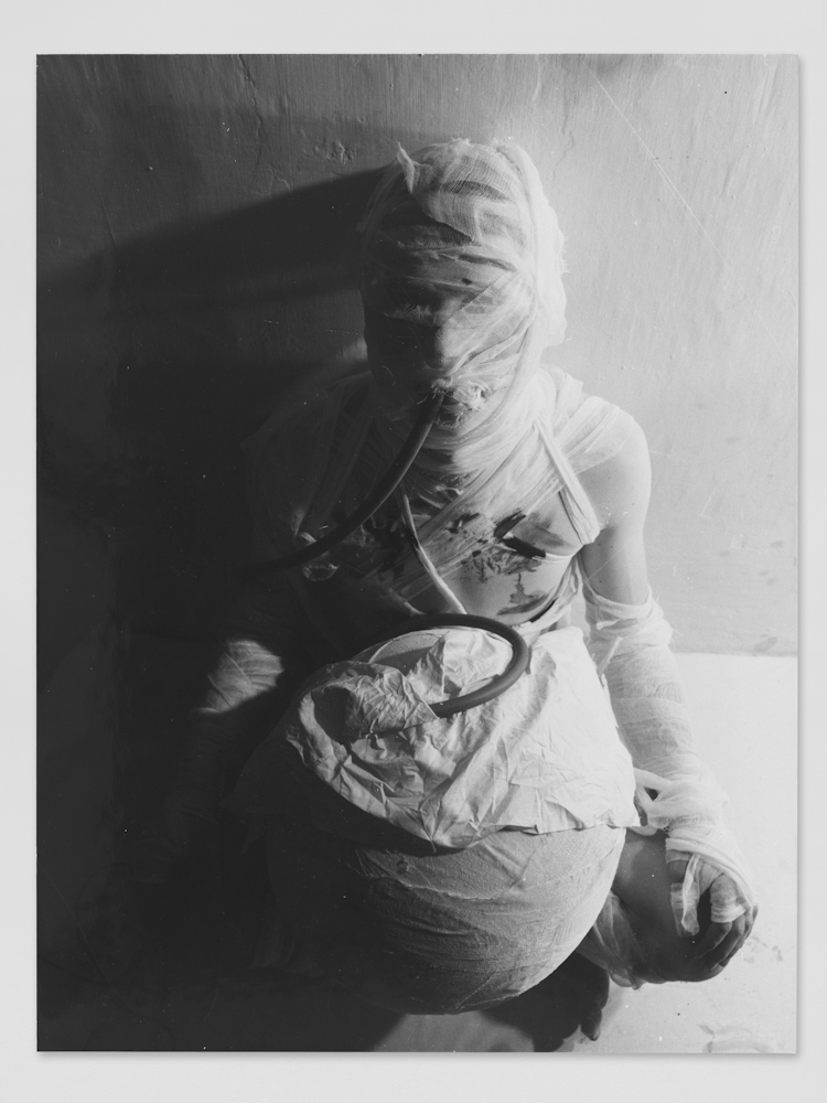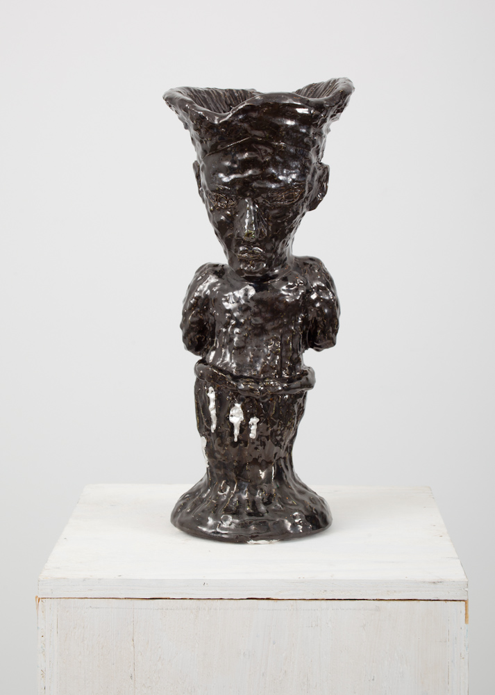 Structure: wood, tape, twine, cheesecloth, wax, paint and shellac. Head sculpture: mud, rope, foam, rubber, shellac and acrylic.