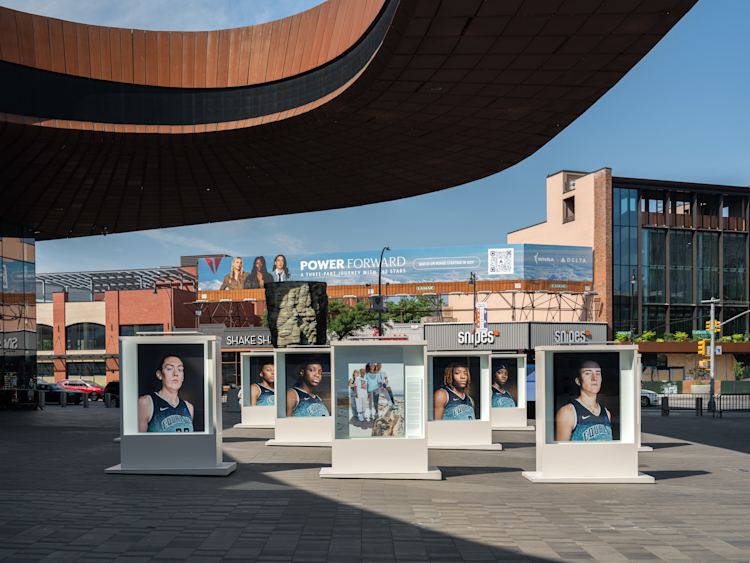 The series, Frazier’s first outdoor installation, celebrates the New York Liberty as professional athletes, reflecting the power of female leadership, influence, diversity, love for the game of basketball and family. Referencing the heroic scale of the Statue of Liberty, Frazier designed double-sided, nine-foot-tall portraits of each player on the 2024 roster presented in architectural display cases —one side featuring a portrait of a player in uniform, and the reverse side showcasing an image of the same player with their chosen family. To make the latter portraits, Frazier visited the players in locations meaningful to them, including spending time with Jonquel Jones’ family in the Bahamas and visiting players in Texas, Arkansas and Alabama, among other locations. Known for incorporating storytelling in her work, Frazier’s portraits also include the voice of a loved one chosen by each player as first-person testimonies on text panels. The Liberty Portraits: A Monument to the 2024 Champions will be on display through the 2025 WNBA season.