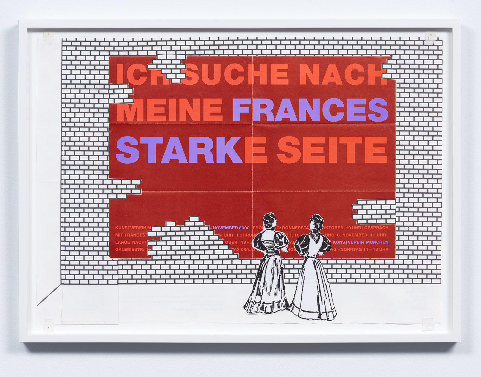 Frances Stark (b. 1967, Newport Beach, California) lives and works in Los Angeles, California. Stark addresses the conditions of creative labor, producing candid and affecting work about the nature of artistic practice and the corresponding yet integral banality of the everyday. The artist’s body of work stands as a self-reflexive inquiry into the process of artistic production, and the often-elided demands of daily life. Stark makes drawings, collages, videos, PowerPoints, performances, and paintings that have been extensively exhibited in museums and galleries worldwide.