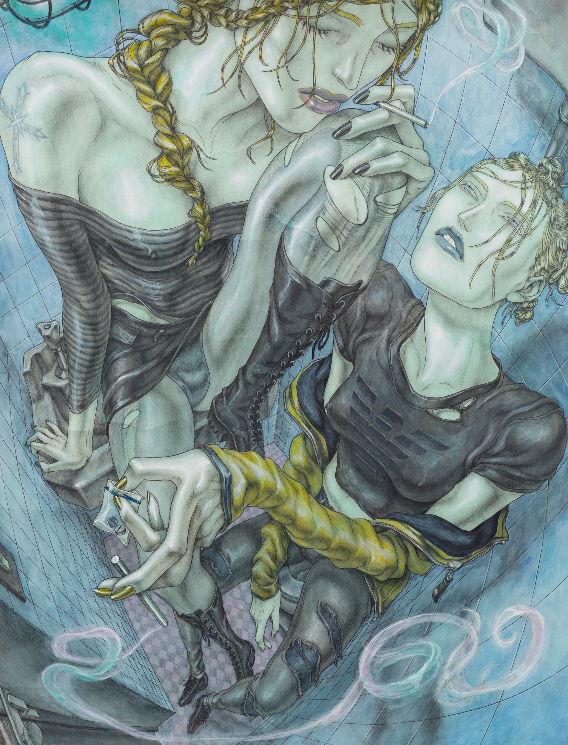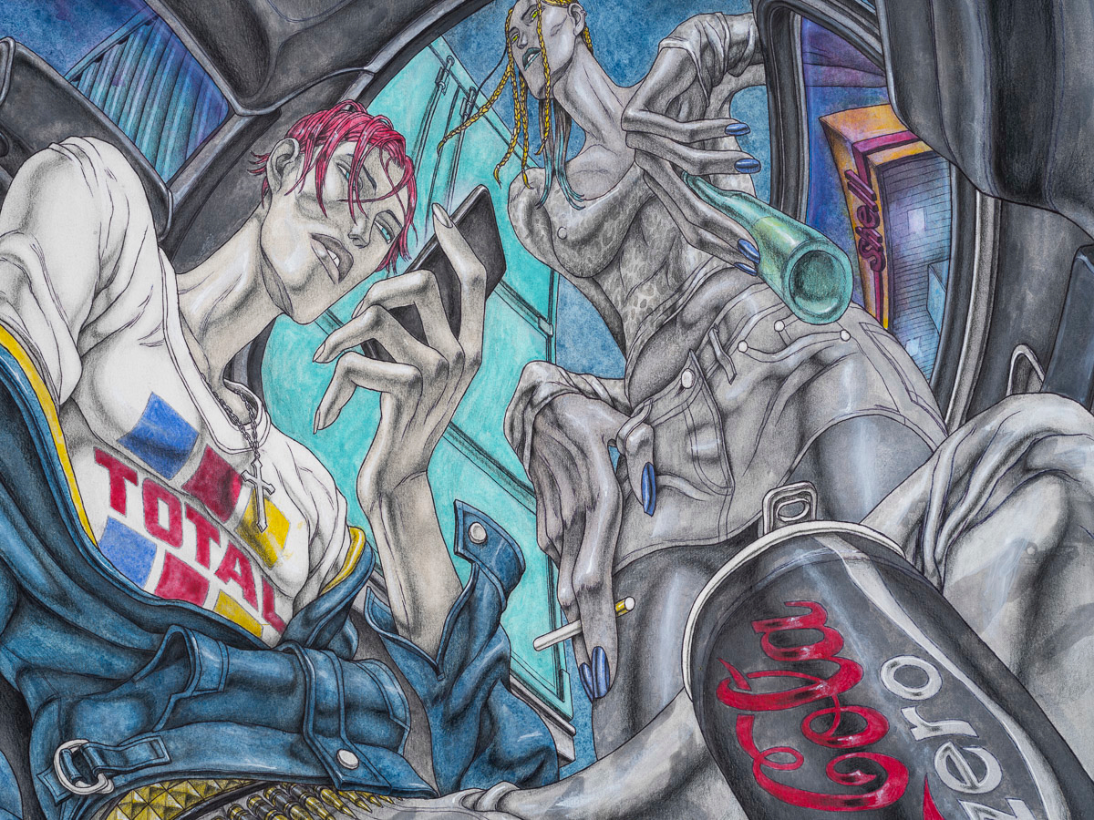 David Rappeneau is a French artist. Those are the only facts he will confirm: his name, citizenry, and occupation. In a time of ever-expanding transparency and dissolving privacy standards, his refusal to participate in interviews, appear at his openings, or participate in person with the art world stands apart from accepted practices of self-promotion. Often referred to as an enigma himself, Rappeneau’s work mirrors this aura of laconic mystique, creating a stark contrast between heavily and carefully worked drawings and an artist impossible to see. His drawings, devoid of explicit language, employ ballpoint pens, fluorescent markers, and acrylic paint to craft distorted yet deeply saturated depictions of enigmatic individuals and cryptic landscapes. His subjects can be grungy youth, absorbed in mundane yet mesmerizing activities, video games, fleeting encounters, conspicuous consumption, or any other quickly achievable means of escape. Rappeneau’s depictions recall surrealism with a documentarian lens, revealing youth culture with the stylized allure reminiscent of graphic novels and anime, with art historical references as far reaching as Mannerism, Albrecht Dürer, and Egon Schiele. Experimenting with perspective and figuration, Rappeneau captures the complexities of youth within an eerie and seductive world. Rappeneau’s provocative artworks offer a glimpse into a dystopian realm where mutated bodies, narcotics, and melancholic longing converge within the embodied celestial creations. David Rappeneau has exhibited with Gladstone Gallery, Brussels; Queer Thoughts; FRAC Corsica; Super Dakota; Galerie Derouillon; Peres Projects; Edward Ressle; Centre d’Art Contemporain La Synagogue de Delme; Galerie Crevecoeur.